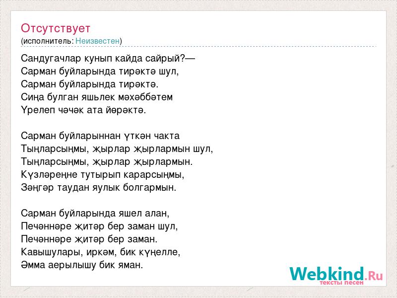 Сандугачлар кунып кайда сайрый?— Сарман буйларында тирәктә шул, Сарман буйларында тирәктә. Сиңа булган яшьлек мәхәббәтем Үрелеп чәчәк ата йөрәктә. Сарман буйларыннан үткән чакта Тыңларсыңмы, җырлар җырлармын шул, Тыңларсыңмы, җырлар җырлармын. Күзләреңне тутырып карарсыңмы, Зәңгәр таудан яулык болгармын. Сарман буйларында яшел алан, Печәннәре җитәр бер заман шул, Печәннәре җитәр бер заман. Кавышулары, иркәм, бик күңелле, Әмма аерылышу бик яман.