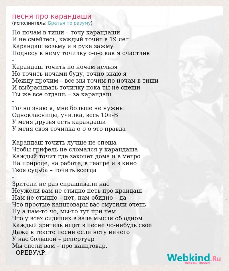 По ночам в тиши – точу карандаши И не смейтесь, каждый точит в 19 лет Карандаш возьму и в руке зажму Поднесу к нему точилку о-о-о как я счастлив - Карандаш точить по ночам нельзя Но точить ночами буду, точно знаю я Между прочим – все мы точим по ночам в тиши И выбрасывать точилку пока ты не спеши Ты же все отдашь – за карандаш - Точно знаю я, мне больше не нужны Однокласницы, училка, весь 10й-Б У меня друзья есть карандаши У меня своя точилка о-о-о это правда - Карандаш точить лучше не спеша Чтобы грифель не сломался у карандаша Каждый точит где захочет дома и в метро На природе, на работе, в театре и в кино Твоя судьба – точить всегда - Зрители не раз спрашивали нас Неужели вам не стыдно петь про крандаш Нам не стыдно – нет, нам обидно – да Что простые канцтовары вас смутили очень Ну а нам-то чо, мы-то тут при чем Что у всех сидящих в зале мысли об одном Каждый зритель ищет в песне чо-нибудь свое Даже в тексте песни если нету ничего У нас большой – репертуар Мы спели вам – про канцтовар. - ОРЕВУАР.