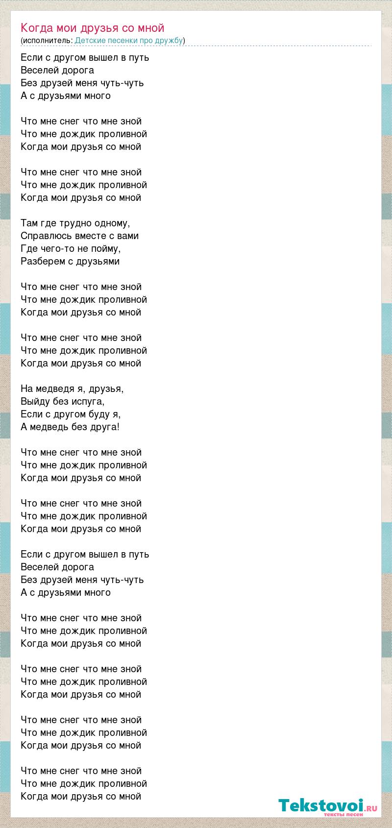Если с другом вышел в путь Веселей дорога Без друзей меня чуть-чуть А с друзьями много Что мне снег что мне зной Что мне дождик проливной Когда мои друзья со мной Что мне снег что мне зной Что мне дождик проливной Когда мои друзья со мной Там где трудно одному, Справлюсь вместе с вами Где чего-то не пойму, Разберем с друзьями Что мне снег что мне зной Что мне дождик проливной Когда мои друзья со мной Что мне снег что мне зной Что мне дождик проливной Когда мои друзья со мной На медведя я, друзья, Выйду без испуга, Если с другом буду я, А медведь без друга! Что мне снег что мне зной Что мне дождик проливной Когда мои друзья со мной Что мне снег что мне зной Что мне дождик проливной Когда мои друзья со мной Если с другом вышел в путь Веселей дорога Без друзей меня чуть-чуть А с друзьями много Что мне снег что мне зной Что мне дождик проливной Когда мои друзья со мной Что мне снег что мне зной Что мне дождик проливной Когда мои друзья со мной Что мне снег что мне зной Что мне дождик проливной Когда мои друзья со мной Что мне снег что мне зной Что мне дождик проливной Когда мои друзья со мной