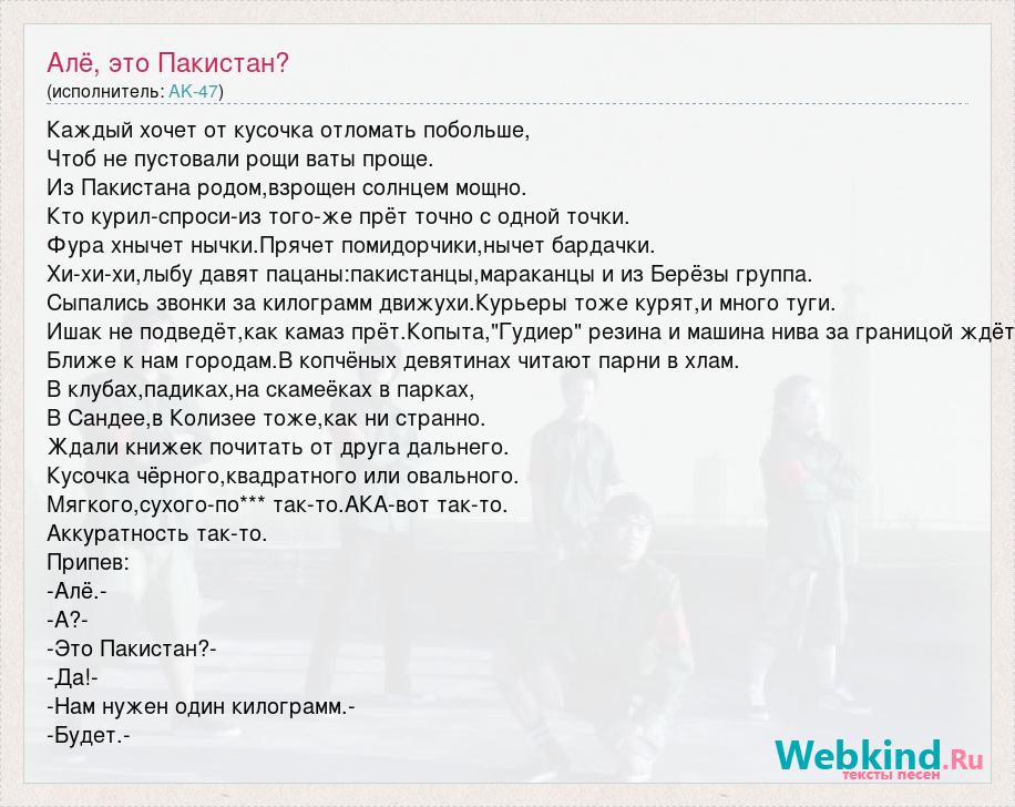 Каждый хочет от кусочка отломать побольше, Чтоб не пустовали рощи ваты проще. Из Пакистана родом,взрощен солнцем мощно. Кто курил-спроси-из того-же прёт точно с одной точки. Фура хнычет нычки.Прячет помидорчики,нычет бардачки. Хи-хи-хи,лыбу давят пацаны:пакистанцы,мараканцы и из Берёзы группа. Сыпались звонки за килограмм движухи.Курьеры тоже курят,и много туги. Ишак не подведёт,как камаз прёт.Копыта,"Гудиер" резина и машина нива за границой ждёт Ближе к нам городам.В копчёных девятинах читают парни в хлам. В клубах,падиках,на скамеёках в парках, В Сандее,в Колизее тоже,как ни странно. Ждали книжек почитать от друга дальнего. Кусочка чёрного,квадратного или овального. Мягкого,сухого-по*** так-то.АКА-вот так-то. Аккуратность так-то. Припев: -Алё.- -А?- -Это Пакистан?- -Да!- -Нам нужен один килограмм.- -Будет.-