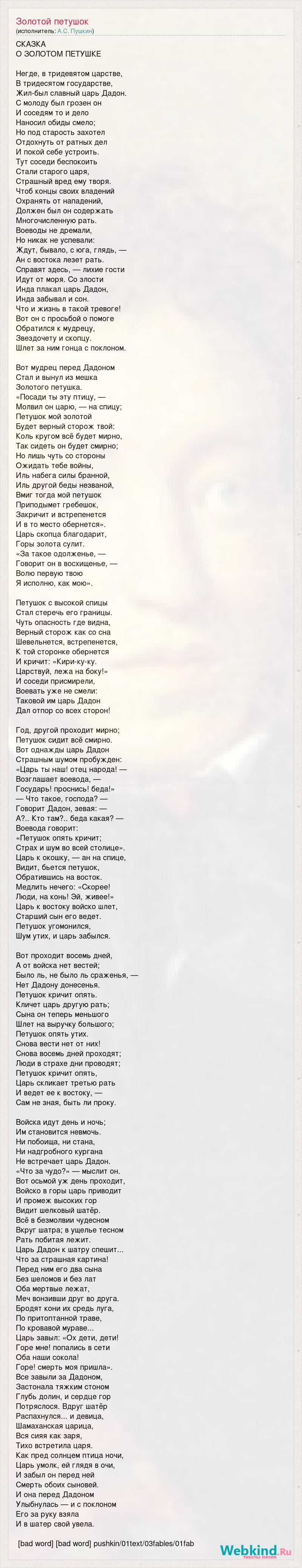 СКАЗКА О ЗОЛОТОМ ПЕТУШКЕ Негде, в тридевятом царстве, В тридесятом государстве, Жил-был славный царь Дадон. С молоду был грозен он И соседям то и дело Наносил обиды смело; Но под старость захотел Отдохнуть от ратных дел И покой себе устроить. Тут соседи беспокоить Стали старого царя, Страшный вред ему творя. Чтоб концы своих владений Охранять от нападений, Должен был он содержать Многочисленную рать. Воеводы не дремали, Но никак не успевали: Ждут, бывало, с юга, глядь, — Ан с востока лезет рать. Справят здесь, — лихие гости Идут от моря. Со злости Инда плакал царь Дадон, Инда забывал и сон. Что и жизнь в такой тревоге! Вот он с просьбой о помоге Обратился к мудрецу, Звездочету и скопцу. Шлет за ним гонца с поклоном. Вот мудрец перед Дадоном Стал и вынул из мешка Золотого петушка. «Посади ты эту птицу, — Молвил он царю, — на спицу; Петушок мой золотой Будет верный сторож твой: Коль кругом всё будет мирно, Так сидеть он будет смирно; Но лишь чуть со стороны Ожидать тебе войны, Иль набега силы бранной, Иль другой беды незваной, Вмиг тогда мой петушок Приподымет гребешок, Закричит и встрепенется И в то место обернется». Царь скопца благодарит, Горы золота сулит. «За такое одолженье, — Говорит он в восхищенье, — Волю первую твою Я исполню, как мою». Петушок с высокой спицы Стал стеречь его границы. Чуть опасность где видна, Верный сторож как со сна Шевельнется, встрепенется, К той сторонке обернется И кричит: «Кири-ку-ку. Царствуй, лежа на боку!» И соседи присмирели, Воевать уже не смели: Таковой им царь Дадон Дал отпор со всех сторон! Год, другой проходит мирно; Петушок сидит всё смирно. Вот однажды царь Дадон Страшным шумом пробужден: «Царь ты наш! отец народа! — Возглашает воевода, — Государь! проснись! беда!» — Что такое, господа? — Говорит Дадон, зевая: — А?.. Кто там?.. беда какая? — Воевода говорит: «Петушок опять кричит; Страх и шум во всей столице». Царь к окошку, — ан на спице, Видит, бьется петушок, Обратившись на восток. Медлить нечего: «Скорее! Люди, на конь! Эй, живее!» Царь к востоку войско шлет, Старший сын его ведет. Петушок угомонился, Шум утих, и царь забылся. Вот проходит восемь дней, А от войска нет вестей; Было ль, не было ль сраженья, — Нет Дадону донесенья. Петушок кричит опять. Кличет царь другую рать; Сына он теперь меньшого Шлет на выручку большого; Петушок опять утих. Снова вести нет от них! Снова восемь дней проходят; Люди в страхе дни проводят; Петушок кричит опять, Царь скликает третью рать И ведет ее к востоку, — Сам не зная, быть ли проку. Войска идут день и ночь; Им становится невмочь. Ни побоища, ни стана, Ни надгробного кургана Не встречает царь Дадон. «Что за чудо?» — мыслит он. Вот осьмой уж день проходит, Войско в горы царь приводит И промеж высоких гор Видит шелковый шатёр. Всё в безмолвии чудесном Вкруг шатра; в ущелье тесном Рать побитая лежит. Царь Дадон к шатру спешит... Что за страшная картина! Перед ним его два сына Без шеломов и без лат Оба мертвые лежат, Меч вонзивши друг во друга. Бродят кони их средь луга, По притоптанной траве, По кровавой мураве... Царь завыл: «Ох дети, дети! Горе мне! попались в сети Оба наши сокола! Горе! смерть моя пришла». Все завыли за Дадоном, Застонала тяжким стоном Глубь долин, и сердце гор Потряслося. Вдруг шатёр Распахнулся... и девица, Шамаханская царица, Вся сияя как заря, Тихо встретила царя. Как пред солнцем п