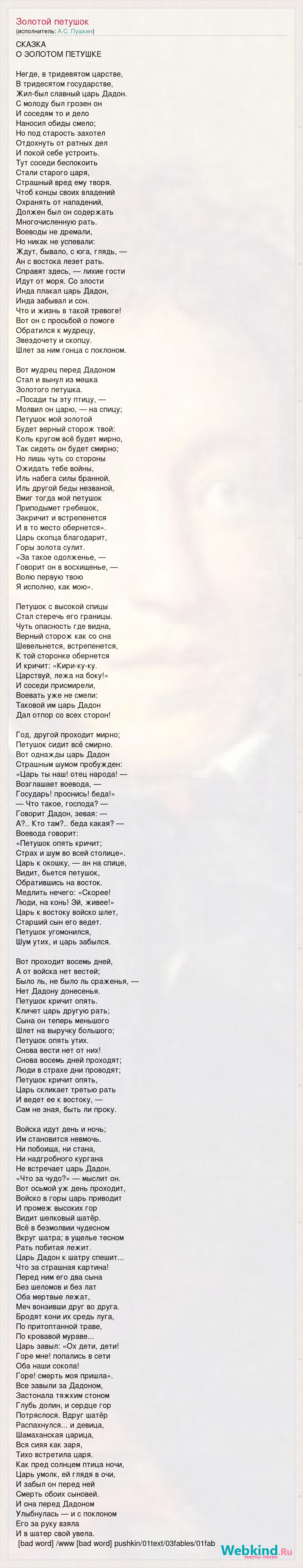 СКАЗКА О ЗОЛОТОМ ПЕТУШКЕ Негде, в тридевятом царстве, В тридесятом государстве, Жил-был славный царь Дадон. С молоду был грозен он И соседям то и дело Наносил обиды смело; Но под старость захотел Отдохнуть от ратных дел И покой себе устроить. Тут соседи беспокоить Стали старого царя, Страшный вред ему творя. Чтоб концы своих владений Охранять от нападений, Должен был он содержать Многочисленную рать. Воеводы не дремали, Но никак не успевали: Ждут, бывало, с юга, глядь, — Ан с востока лезет рать. Справят здесь, — лихие гости Идут от моря. Со злости Инда плакал царь Дадон, Инда забывал и сон. Что и жизнь в такой тревоге! Вот он с просьбой о помоге Обратился к мудрецу, Звездочету и скопцу. Шлет за ним гонца с поклоном. Вот мудрец перед Дадоном Стал и вынул из мешка Золотого петушка. «Посади ты эту птицу, — Молвил он царю, — на спицу; Петушок мой золотой Будет верный сторож твой: Коль кругом всё будет мирно, Так сидеть он будет смирно; Но лишь чуть со стороны Ожидать тебе войны, Иль набега силы бранной, Иль другой беды незваной, Вмиг тогда мой петушок Приподымет гребешок, Закричит и встрепенется И в то место обернется». Царь скопца благодарит, Горы золота сулит. «За такое одолженье, — Говорит он в восхищенье, — Волю первую твою Я исполню, как мою». Петушок с высокой спицы Стал стеречь его границы. Чуть опасность где видна, Верный сторож как со сна Шевельнется, встрепенется, К той сторонке обернется И кричит: «Кири-ку-ку. Царствуй, лежа на боку!» И соседи присмирели, Воевать уже не смели: Таковой им царь Дадон Дал отпор со всех сторон! Год, другой проходит мирно; Петушок сидит всё смирно. Вот однажды царь Дадон Страшным шумом пробужден: «Царь ты наш! отец народа! — Возглашает воевода, — Государь! проснись! беда!» — Что такое, господа? — Говорит Дадон, зевая: — А?.. Кто там?.. беда какая? — Воевода говорит: «Петушок опять кричит; Страх и шум во всей столице». Царь к окошку, — ан на спице, Видит, бьется петушок, Обратившись на восток. Медлить нечего: «Скорее! Люди, на конь! Эй, живее!» Царь к востоку войско шлет, Старший сын его ведет. Петушок угомонился, Шум утих, и царь забылся. Вот проходит восемь дней, А от войска нет вестей; Было ль, не было ль сраженья, — Нет Дадону донесенья. Петушок кричит опять. Кличет царь другую рать; Сына он теперь меньшого Шлет на выручку большого; Петушок опять утих. Снова вести нет от них! Снова восемь дней проходят; Люди в страхе дни проводят; Петушок кричит опять, Царь скликает третью рать И ведет ее к востоку, — Сам не зная, быть ли проку. Войска идут день и ночь; Им становится невмочь. Ни побоища, ни стана, Ни надгробного кургана Не встречает царь Дадон. «Что за чудо?» — мыслит он. Вот осьмой уж день проходит, Войско в горы царь приводит И промеж высоких гор Видит шелковый шатёр. Всё в безмолвии чудесном Вкруг шатра; в ущелье тесном Рать побитая лежит. Царь Дадон к шатру спешит... Что за страшная картина! Перед ним его два сына Без шеломов и без лат Оба мертвые лежат, Меч вонзивши друг во друга. Бродят кони их средь луга, По притоптанной траве, По кровавой мураве... Царь завыл: «Ох дети, дети! Горе мне! попались в сети Оба наши сокола! Горе! смерть моя пришла». Все завыли за Дадоном, Застонала тяжким стоном Глубь долин, и сердце гор Потряслося. Вдруг шатёр Распахнулся... и девица, Шамаханская царица, Вся сияя как заря, Тихо встретила царя. Как пред солнцем п