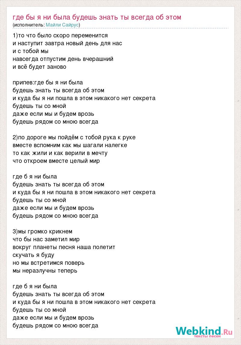 1)то что было скоро переменится и наступит завтра новый день для нас и с тобой мы навсегда отпустим день вчерашний и всё будет заново припев:где бы я ни была будешь знать ты всегда об этом и куда бы я ни пошла в этом никакого нет секрета будешь ты со мной даже если мы и будем врозь будешь рядом со мною всегда 2)по дороге мы пойдём с тобой рука к руке вместе вспомним как мы шагали налегке то как жили и как верили в мечту что откроем вместе целый мир где б я ни была будешь знать ты всегда об этом и куда бы я ни пошла в этом никакого нет секрета будешь ты со мной даже если мы и будем врозь будешь рядом со мною всегда 3)мы громко крикнем что бы нас заметил мир вокруг планеты песня наша полетит скучать я буду но мы встретимся поверь мы неразлучны теперь где б я ни была будешь знать ты всегда об этом и куда бы я ни пошла в этом никакого нет секрета будешь ты со мной даже если мы и будем врозь будешь рядом со мною всегда