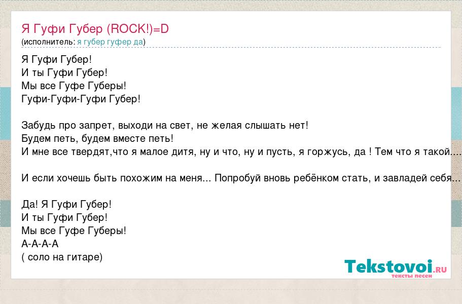 Я Гуфи Губер! И ты Гуфи Губер! Мы все Гуфе Губеры! Гуфи-Гуфи-Гуфи Губер! Забудь про запрет, выходи на свет, не желая слышать нет! Будем петь, будем вместе петь! И мне все твердят,что я малое дитя, ну и что, ну и пусть, я горжусь, да ! Тем что я такой.... И если хочешь быть похожим на меня... Попробуй вновь ребёнком стать, и завладей себя... Да! Я Гуфи Губер! И ты Гуфи Губер! Мы все Гуфе Губеры! А-А-А-А ( соло на гитаре)
