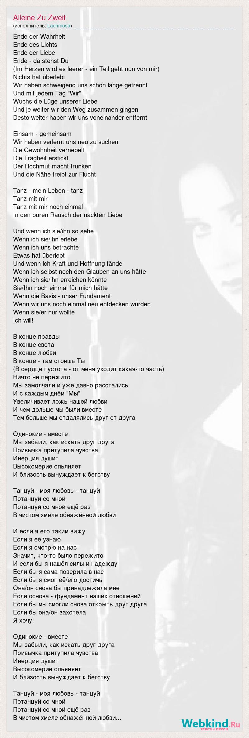 Ende der Wahrheit Ende des Lichts Ende der Liebe Ende - da stehst Du (Im Herzen wird es leerer - ein Teil geht nun von mir) Nichts hat überlebt Wir haben schweigend uns schon lange getrennt Und mit jedem Tag "Wir" Wuchs die Lüge unserer Liebe Und je weiter wir den Weg zusammen gingen Desto weiter haben wir uns voneinander entfernt Einsam - gemeinsam Wir haben verlernt uns neu zu suchen Die Gewohnheit vernebelt Die Trägheit erstickt Der Hochmut macht trunken Und die Nähe treibt zur Flucht Tanz - mein Leben - tanz Tanz mit mir Tanz mit mir noch einmal In den puren Rausch der nackten Liebe Und wenn ich sie/ihn so sehe Wenn ich sie/ihn erlebe Wenn ich uns betrachte Etwas hat überlebt Und wenn ich Kraft und Hoffnung fände Wenn ich selbst noch den Glauben an uns hätte Wenn ich sie/ihn erreichen könnte Sie/Ihn noch einmal für mich hätte Wenn die Basis - unser Fundament Wenn wir uns noch einmal neu entdecken würden Wenn sie/er nur wollte Ich will! В конце правды В конце света В конце любви В конце - там стоишь Ты (В сердце пустота - от меня уходит какая-то часть) Ничто не пережито Мы замолчали и уже давно расстались И с каждым днём "Мы" Увеличивает ложь нашей любви И чем дольше мы были вместе Тем больше мы отдалялись друг от друга Одинокие - вместе Мы забыли, как искать друг друга Привычка притупила чувства Инерция душит Высокомерие опьяняет И близость вынуждает к бегству Танцуй - моя любовь - танцуй Потанцуй со мной Потанцуй со мной ещё раз В чистом хмеле обнажённой любви И если я его таким вижу Если я её узнаю Если я смотрю на нас Значит, что-то было пережито И если бы я нашёл силы и надежду Если бы я сама поверила в нас Если бы я смог её/его достичь Она/он снова бы принадлежала мне Если основа - фундамент наших отношений Если бы мы смогли снова открыть друг друга Если бы она/он захотела Я хочу! Одинокие - вместе Мы забыли, как искать друг друга Привычка притупила чувства Инерция душит Высокомерие опьяняет И близость вынуждает к бегству Танцуй - моя любовь - танцуй Потанцуй со мной Потанцуй со мной ещё раз В чистом хмеле обнажённой любви...