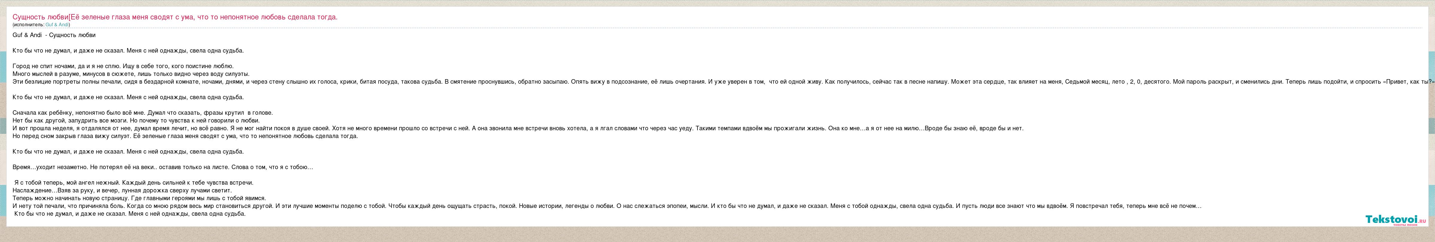 Guf & Andi - Сущность любви Кто бы что не думал, и даже не сказал. Меня с ней однажды, свела одна судьба. Город не спит ночами, да и я не сплю. Ищу в себе того, кого поистине люблю. Много мыслей в разуме, минусов в сюжете, лишь только видно через воду силуэты. Эти безлицие портреты полны печали, сидя в бездарной комнате, ночами, днями, и через стену слышно их голоса, крики, битая посуда, такова судьба. В смятение проснувшись, обратно засыпаю. Опять вижу в подсознание, её лишь очертания. И уже уверен в том, что ей одной живу. Как получилось, сейчас так в песне напишу. Может эта сердце, так влияет на меня, Седьмой месяц, лето , 2, 0, десятого. Мой пароль раскрыт, и сменились дни. Теперь лишь подойти, и спросить «Привет, как ты?» Кто бы что не думал, и даже не сказал. Меня с ней однажды, свела одна судьба. Сначала как ребёнку, непонятно было всё мне. Думал что сказать, фразы крутил в голове. Нет бы как другой, запудрить все мозги. Но почему то чувства к ней говорили о любви. И вот прошла неделя, я отдалялся от нее, думал время лечит, но всё равно. Я не мог найти покоя в душе своей. Хотя не много времени прошло со встречи с ней. А она звонила мне встречи вновь хотела, а я лгал словами что через час уеду. Такими темпами вдвоём мы прожигали жизнь. Она ко мне…а я от нее на милю…Вроде бы знаю её, вроде бы и нет. Но перед сном закрыв глаза вижу силуэт. Её зеленые глаза меня сводят с ума, что то непонятное любовь сделала тогда. Кто бы что не думал, и даже не сказал. Меня с ней однажды, свела одна судьба. Время…уходит незаметно. Не потерял её на веки.. оставив только на листе. Слова о том, что я с тобою… Я с тобой теперь, мой ангел нежный. Каждый день сильней к тебе чувства встречи. Наслаждение…Взяв за руку, и вечер, лунная дорожка сверху лучами светит. Теперь можно начинать новую страницу. Где главными героями мы лишь с тобой явимся. И нету той печали, что причиняла боль. Когда со мною рядом весь мир становиться другой. И эти лучшие моменты поделю с тобой. Чтобы каждый день ощущать страсть, покой. Новые истории, легенды о любви. О нас слежаться эпопеи, мысли. И кто бы что не думал, и даже не сказал. Меня с тобой однажды, свела одна судьба. И пусть люди все знают что мы вдвоём. Я повстречал тебя, теперь мне всё не почем… Кто бы что не думал, и даже не сказал. Меня с ней однажды, свела одна судьба.