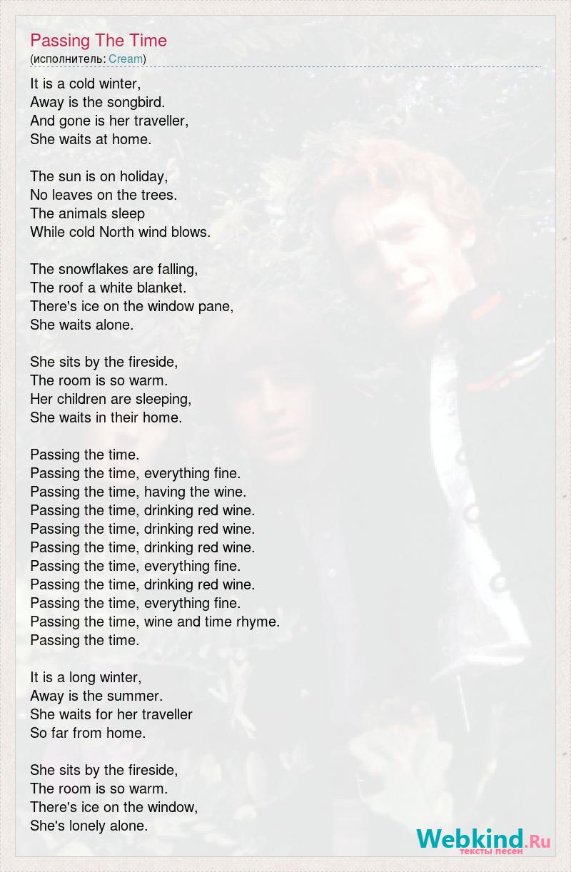 It is a cold winter, Away is the songbird. And gone is her traveller, She waits at home. The sun is on holiday, No leaves on the trees. The animals sleep While cold North wind blows. The snowflakes are falling, The roof a white blanket. There's ice on the window pane, She waits alone. She sits by the fireside, The room is so warm. Her children are sleeping, She waits in their home. Passing the time. Passing the time, everything fine. Passing the time, having the wine. Passing the time, drinking red wine. Passing the time, drinking red wine. Passing the time, drinking red wine. Passing the time, everything fine. Passing the time, drinking red wine. Passing the time, everything fine. Passing the time, wine and time rhyme. Passing the time. It is a long winter, Away is the summer. She waits for her traveller So far from home. She sits by the fireside, The room is so warm. There's ice on the window, She's lonely alone.