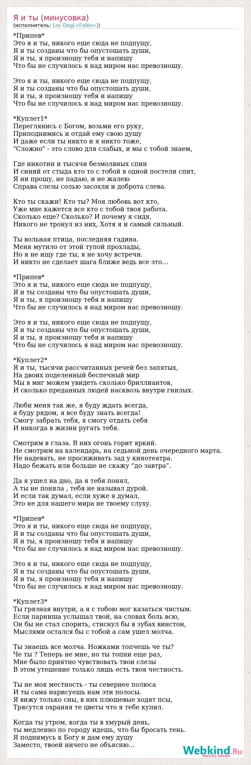 *Припев* Это я и ты, никого еще сюда не подпущу, Я и ты созданы что бы опустошать души, Я и ты, я произношу тебя и напишу Что бы не случилось я над миром нас превозношу. Это я и ты, никого еще сюда не подпущу, Я и ты созданы что бы опустошать души, Я и ты, я произношу тебя и напишу Что бы не случилось я над миром нас превозношу. *Куплет1* Переглянись с Богом, возьми его руку, Приподнимись и отдай ему свою душу И даже если ты никто и я никто тоже, "Сложно" - это слово для слабых, и мы с тобой знаем, Где никотин и тысячи безмолвных спин И синий от стыда кто то с тобой в одной постели спит, Я ни прошу, не падаю, и не жалею Справа слезы солью засохли и доброта слева. Кто ты скажи! Кто ты? Моя любовь вот кто, Уже мне кажется все кто с тобой твоя работа. Сколько еще? Сколько? И почему я сидя, Никого не тронул из них, Хотя я и самый сильный. Ты вольная птица, последняя гадина. Меня мутило от этой тупой прохлады, Но я не ищу где ты, я не хочу встречи. И никто не сделает шага ближе ведь все это… *Припев* Это я и ты, никого еще сюда не подпущу, Я и ты созданы что бы опустошать души, Я и ты, я произношу тебя и напишу Что бы не случилось я над миром нас превозношу. Это я и ты, никого еще сюда не подпущу, Я и ты созданы что бы опустошать души, Я и ты, я произношу тебя и напишу Что бы не случилось я над миром нас превозношу. *Куплет2* Я и ты, тысячи рассчитанных речей без запятых, На двоих поделенный беспечный мир Мы в миг можем увидеть сколько бриллиантов, И сколько преданных людей насквозь внутри гнилых. Люби меня так же, я буду ждать всегда, я буду рядом, я все буду знать всегда! Смогу забрать тебя, я смогу отдать себя И никогда в жизни ругать тебя. Смотрим в глаза. В них огонь горит яркий. Не смотрим на календарь, на седьмой день очередного марта. Не надевать, не просиживать зад у кинотеатра. Надо бежать или больше не скажу “до завтра”. Да я ушел на дно, да я тебя понял, А ты не поняла , тебя не называл дурой. И если так думал, если хуже я думал, Это не для нашего мира не твоему слуху. *Припев* Это я и ты, никого еще сюда не подпущу, Я и ты созданы что бы опустошать души, Я и ты, я произношу тебя и напишу Что бы не случилось я над миром нас превозношу. Это я и ты, никого еще сюда не подпущу, Я и ты созданы что бы опустошать души, Я и ты, я произношу тебя и напишу Что бы не случилось я над миром нас превозношу. *Куплет3* Ты грязная внутри, а я с тобою мог казаться чистым. Если парниша услышал твой, на словах боль всю, Он бы не стал спорить, стиснул бы в зубах винстон, Мыслями остался бы с тобой а сам ушел молча. Ты знаешь все молча. Ножками топчешь че ты? Че ты ? Теперь не мне, но ты топни еще раз, Мне было приятно чувствовать твои слезы В этом утешение только лишь есть твоя честность. Ты не моя местность - ты севернее полюса И ты сама нарисуешь нам эти полосы. Я вижу только сны, в них плюшевые ходят псы, Трясутся охраняя те цветы что я тебе купил. Когда ты утром, когда ты в хмурый день, ты медленно по городу идешь, что бы бросать тень. Я поднимусь к Богу и дам ему душу Заместо, твоей ничего не объясню…