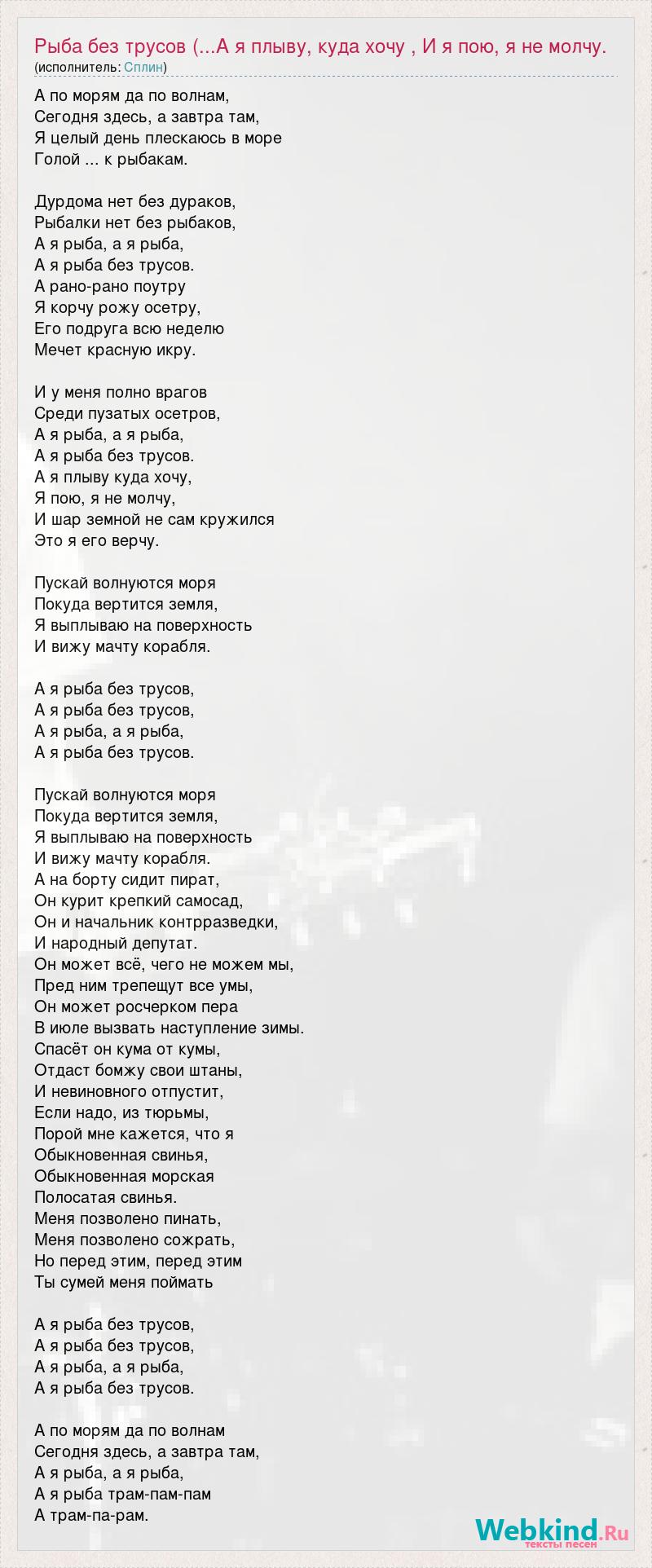 А по морям да по волнам, Сегодня здесь, а завтра там, Я целый день плескаюсь в море Голой ... к рыбакам. Дурдома нет без дураков, Рыбалки нет без рыбаков, А я рыба, а я рыба, А я рыба без трусов. А рано-рано поутру Я корчу рожу осетру, Его подруга всю неделю Мечет красную икру. И у меня полно врагов Среди пузатых осетров, А я рыба, а я рыба, А я рыба без трусов. А я плыву куда хочу, Я пою, я не молчу, И шар земной не сам кружился Это я его верчу. Пускай волнуются моря Покуда вертится земля, Я выплываю на поверхность И вижу мачту корабля. А я рыба без трусов, А я рыба без трусов, А я рыба, а я рыба, А я рыба без трусов. Пускай волнуются моря Покуда вертится земля, Я выплываю на поверхность И вижу мачту корабля. А на борту сидит пират, Он курит крепкий самосад, Он и начальник контрразведки, И народный депутат. Он может всё, чего не можем мы, Пред ним трепещут все умы, Он может росчерком пера В июле вызвать наступление зимы. Спасёт он кума от кумы, Отдаст бомжу свои штаны, И невиновного отпустит, Если надо, из тюрьмы, Порой мне кажется, что я Обыкновенная свинья, Обыкновенная морская Полосатая свинья. Меня позволено пинать, Меня позволено сожрать, Но перед этим, перед этим Ты сумей меня поймать А я рыба без трусов, А я рыба без трусов, А я рыба, а я рыба, А я рыба без трусов. А по морям да по волнам Сегодня здесь, а завтра там, А я рыба, а я рыба, А я рыба трам-пам-пам А трам-па-рам.