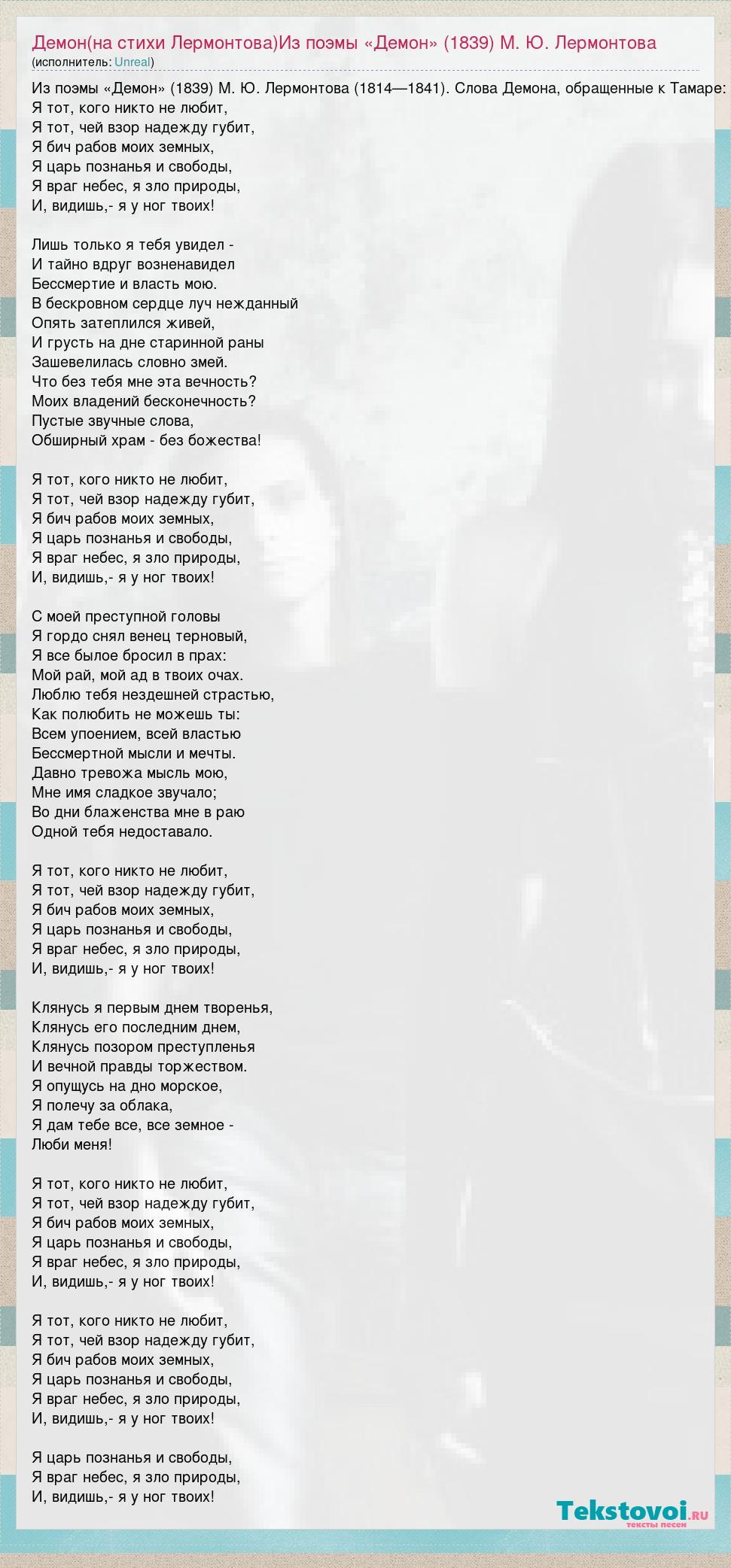Из поэмы «Демон» (1839) М. Ю. Лермонтова (1814—1841). Слова Демона, обращенные к Тамаре: Я тот, кого никто не любит, Я тот, чей взор надежду губит, Я бич рабов моих земных, Я царь познанья и свободы, Я враг небес, я зло природы, И, видишь,- я у ног твоих! Лишь только я тебя увидел - И тайно вдруг возненавидел Бессмертие и власть мою. В бескровном сердце луч нежданный Опять затеплился живей, И грусть на дне старинной раны Зашевелилась словно змей. Что без тебя мне эта вечность? Моих владений бесконечность? Пустые звучные слова, Обширный храм - без божества! Я тот, кого никто не любит, Я тот, чей взор надежду губит, Я бич рабов моих земных, Я царь познанья и свободы, Я враг небес, я зло природы, И, видишь,- я у ног твоих! С моей преступной головы Я гордо снял венец терновый, Я все былое бросил в прах: Мой рай, мой ад в твоих очах. Люблю тебя нездешней страстью, Как полюбить не можешь ты: Всем упоением, всей властью Бессмертной мысли и мечты. Давно тревожа мысль мою, Мне имя сладкое звучало; Во дни блаженства мне в раю Одной тебя недоставало. Я тот, кого никто не любит, Я тот, чей взор надежду губит, Я бич рабов моих земных, Я царь познанья и свободы, Я враг небес, я зло природы, И, видишь,- я у ног твоих! Клянусь я первым днем творенья, Клянусь его последним днем, Клянусь позором преступленья И вечной правды торжеством. Я опущусь на дно морское, Я полечу за облака, Я дам тебе все, все земное - Люби меня! Я тот, кого никто не любит, Я тот, чей взор надежду губит, Я бич рабов моих земных, Я царь познанья и свободы, Я враг небес, я зло природы, И, видишь,- я у ног твоих! Я тот, кого никто не любит, Я тот, чей взор надежду губит, Я бич рабов моих земных, Я царь познанья и свободы, Я враг небес, я зло природы, И, видишь,- я у ног твоих! Я царь познанья и свободы, Я враг небес, я зло природы, И, видишь,- я у ног твоих!