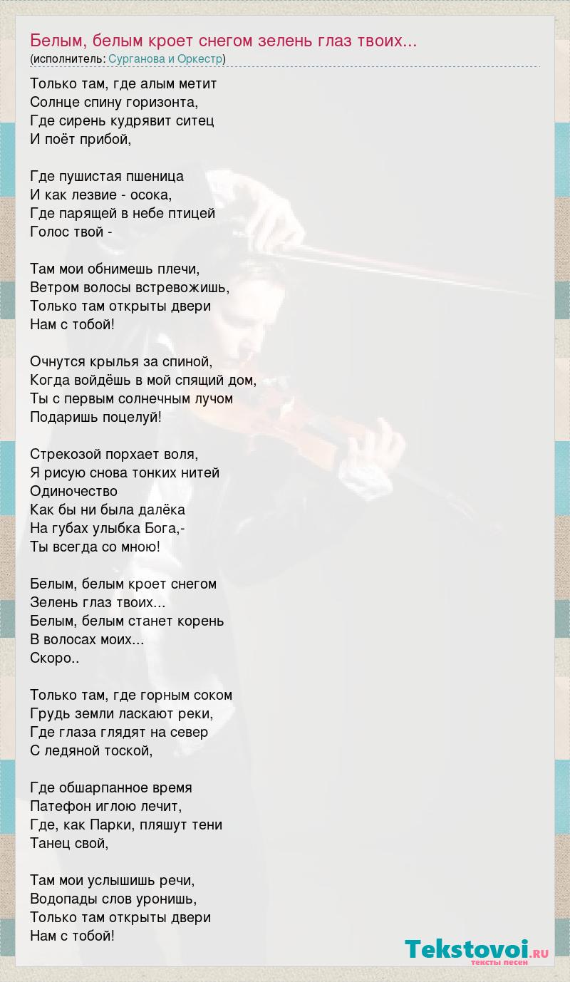 Только там, где алым метит Солнце спину горизонта, Где сирень кудрявит ситец И поёт прибой, Где пушистая пшеница И как лезвие - осока, Где парящей в небе птицей Голос твой - Там мои обнимешь плечи, Ветром волосы встревожишь, Только там открыты двери Нам с тобой! Очнутся крылья за спиной, Когда войдёшь в мой спящий дом, Ты с первым солнечным лучом Подаришь поцелуй! Стрекозой порхает воля, Я рисую снова тонких нитей Одиночество Как бы ни была далёка На губах улыбка Бога,- Ты всегда со мною! Белым, белым кроет снегом Зелень глаз твоих... Белым, белым станет корень В волосах моих... Скоро.. Только там, где горным соком Грудь земли ласкают реки, Где глаза глядят на север С ледяной тоской, Где обшарпанное время Патефон иглою лечит, Где, как Парки, пляшут тени Танец свой, Там мои услышишь речи, Водопады слов уронишь, Только там открыты двери Нам с тобой!