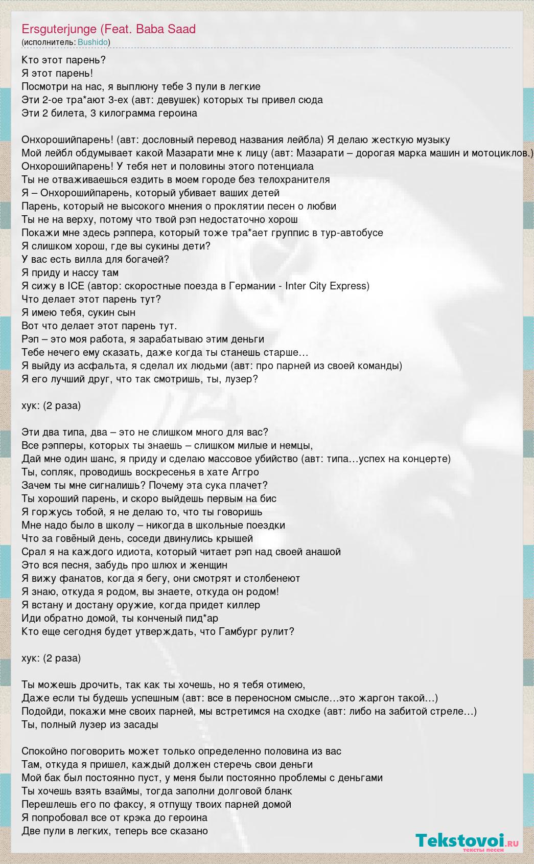 Кто этот парень? Я этот парень! Посмотри на нас, я выплюну тебе 3 пули в легкие Эти 2-ое тра*ают 3-ех (авт: девушек) которых ты привел сюда Эти 2 билета, 3 килограмма героина Онхорошийпарень! (авт: дословный перевод названия лейбла) Я делаю жесткую музыку Мой лейбл обдумывает какой Мазарати мне к лицу (авт: Мазарати – дорогая марка машин и мотоциклов.) Онхорошийпарень! У тебя нет и половины этого потенциала Ты не отваживаешься ездить в моем городе без телохранителя Я – Онхорошийпарень, который убивает ваших детей Парень, который не высокого мнения о проклятии песен о любви Ты не на верху, потому что твой рэп недостаточно хорош Покажи мне здесь рэппера, который тоже тра*ает группис в тур-автобусе Я слишком хорош, где вы сукины дети? У вас есть вилла для богачей? Я приду и нассу там Я сижу в ICE (автор: скоростные поезда в Германии - Inter City Express) Что делает этот парень тут? Я имею тебя, сукин сын Вот что делает этот парень тут. Рэп – это моя работа, я зарабатываю этим деньги Тебе нечего ему сказать, даже когда ты станешь старше… Я выйду из асфальта, я сделал их людьми (авт: про парней из своей команды) Я его лучший друг, что так смотришь, ты, лузер? хук: (2 раза) Эти два типа, два – это не слишком много для вас? Все рэпперы, которых ты знаешь – слишком милые и немцы, Дай мне один шанс, я приду и сделаю массовое убийство (авт: типа…успех на концерте) Ты, сопляк, проводишь воскресенья в хате Аггро Зачем ты мне сигналишь? Почему эта сука плачет? Ты хороший парень, и скоро выйдешь первым на бис Я горжусь тобой, я не делаю то, что ты говоришь Мне надо было в школу – никогда в школьные поездки Что за говёный день, соседи двинулись крышей Срал я на каждого идиота, который читает рэп над своей анашой Это вся песня, забудь про шлюх и женщин Я вижу фанатов, когда я бегу, они смотрят и столбенеют Я знаю, откуда я родом, вы знаете, откуда он родом! Я встану и достану оружие, когда придет киллер Иди обратно домой, ты конченый пид*ар Кто еще сегодня будет утверждать, что Гамбург рулит? хук: (2 раза) Ты можешь дрочить, так как ты хочешь, но я тебя отимею, Даже если ты будешь успешным (авт: все в переносном смысле…это жаргон такой…) Подойди, покажи мне своих парней, мы встретимся на сходке (авт: либо на забитой стреле…) Ты, полный лузер из засады Спокойно поговорить может только определенно половина из вас Там, откуда я пришел, каждый должен стеречь свои деньги Мой бак был постоянно пуст, у меня были постоянно проблемы с деньгами Ты хочешь взять взаймы, тогда заполни долговой бланк Перешлешь его по факсу, я отпущу твоих парней домой Я попробовал все от крэка до героина Две пули в легких, теперь все сказано