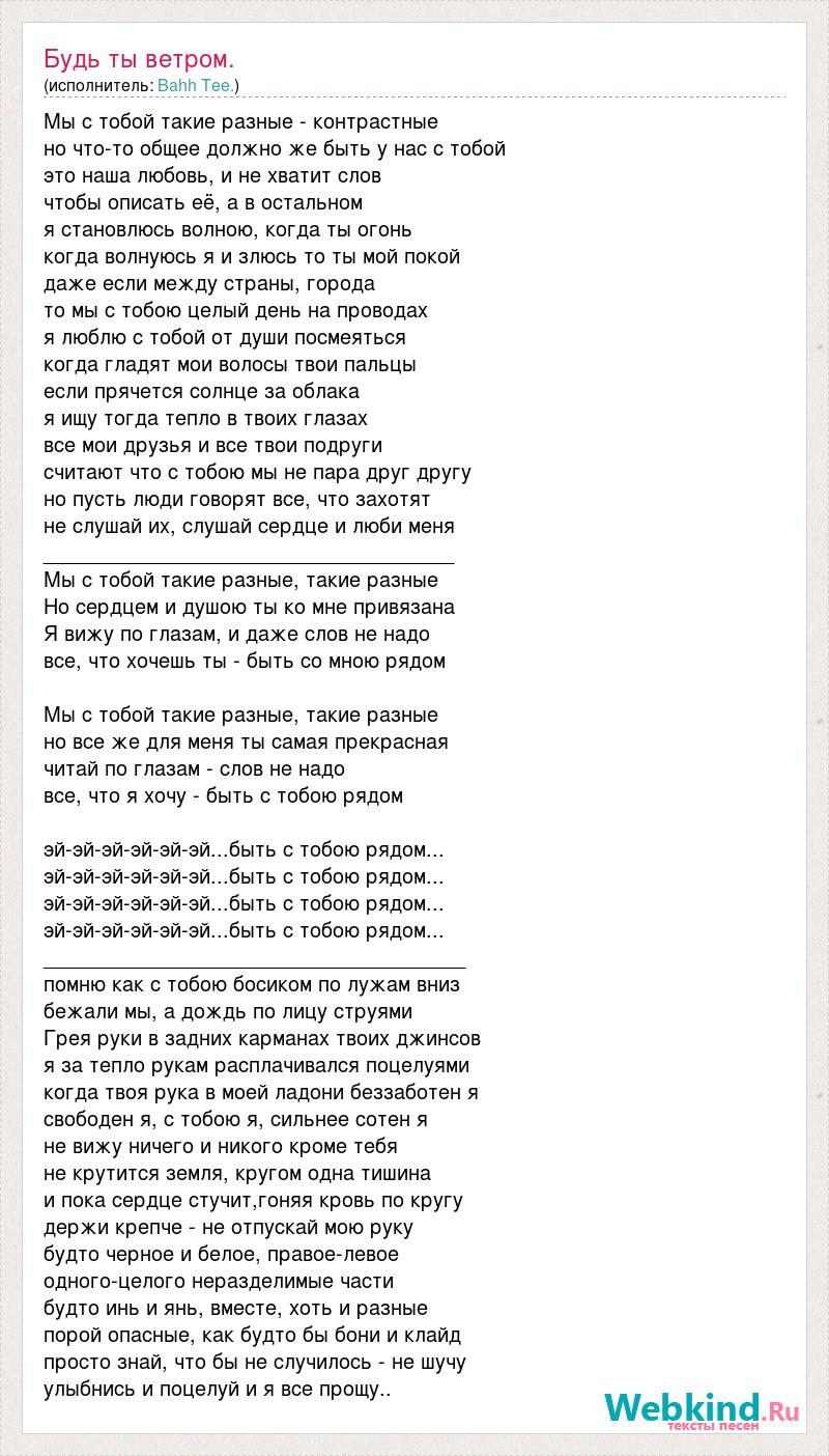 Мы с тобой такие разные - контрастные но что-то общее должно же быть у нас с тобой это наша любовь, и не хватит слов чтобы описать её, а в остальном я становлюсь волною, когда ты огонь когда волнуюсь я и злюсь то ты мой покой даже если между страны, города то мы с тобою целый день на проводах я люблю с тобой от души посмеяться когда гладят мои волосы твои пальцы если прячется солнце за облака я ищу тогда тепло в твоих глазах все мои друзья и все твои подруги считают что с тобою мы не пара друг другу но пусть люди говорят все, что захотят не слушай их, слушай сердце и люби меня ____________________________________ Мы с тобой такие разные, такие разные Но сердцем и душою ты ко мне привязана Я вижу по глазам, и даже слов не надо все, что хочешь ты - быть со мною рядом Мы с тобой такие разные, такие разные но все же для меня ты самая прекрасная читай по глазам - слов не надо все, что я хочу - быть с тобою рядом эй-эй-эй-эй-эй-эй...быть с тобою рядом... эй-эй-эй-эй-эй-эй...быть с тобою рядом... эй-эй-эй-эй-эй-эй...быть с тобою рядом... эй-эй-эй-эй-эй-эй...быть с тобою рядом... _____________________________________ помню как с тобою босиком по лужам вниз бежали мы, а дождь по лицу струями Грея руки в задних карманах твоих джинсов я за тепло рукам расплачивался поцелуями когда твоя рука в моей ладони беззаботен я свободен я, с тобою я, сильнее сотен я не вижу ничего и никого кроме тебя не крутится земля, кругом одна тишина и пока сердце стучит,гоняя кровь по кругу держи крепче - не отпускай мою руку будто черное и белое, правое-левое одного-целого неразделимые части будто инь и янь, вместе, хоть и разные порой опасные, как будто бы бони и клайд просто знай, что бы не случилось - не шучу улыбнись и поцелуй и я все прощу..