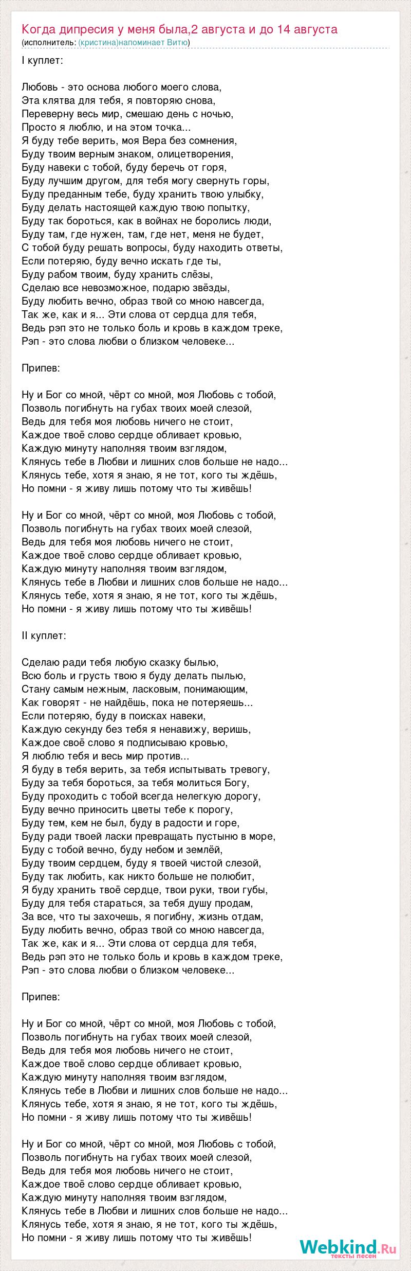 I куплет: Любовь - это основа любого моего слова, Эта клятва для тебя, я повторяю снова, Переверну весь мир, смешаю день с ночью, Просто я люблю, и на этом точка... Я буду тебе верить, моя Вера без сомнения, Буду твоим верным знаком, олицетворения, Буду навеки с тобой, буду беречь от горя, Буду лучшим другом, для тебя могу свернуть горы, Буду преданным тебе, буду хранить твою улыбку, Буду делать настоящей каждую твою попытку, Буду так бороться, как в войнах не боролись люди, Буду там, где нужен, там, где нет, меня не будет, С тобой буду решать вопросы, буду находить ответы, Если потеряю, буду вечно искать где ты, Буду рабом твоим, буду хранить слёзы, Сделаю все невозможное, подарю звёзды, Буду любить вечно, образ твой со мною навсегда, Так же, как и я... Эти слова от сердца для тебя, Ведь рэп это не только боль и кровь в каждом треке, Рэп - это слова любви о близком человеке... Припев: Ну и Бог со мной, чёрт со мной, моя Любовь с тобой, Позволь погибнуть на губах твоих моей слезой, Ведь для тебя моя любовь ничего не стоит, Каждое твоё слово сердце обливает кровью, Каждую минуту наполняя твоим взглядом, Клянусь тебе в Любви и лишних слов больше не надо... Клянусь тебе, хотя я знаю, я не тот, кого ты ждёшь, Но помни - я живу лишь потому что ты живёшь! Ну и Бог со мной, чёрт со мной, моя Любовь с тобой, Позволь погибнуть на губах твоих моей слезой, Ведь для тебя моя любовь ничего не стоит, Каждое твоё слово сердце обливает кровью, Каждую минуту наполняя твоим взглядом, Клянусь тебе в Любви и лишних слов больше не надо... Клянусь тебе, хотя я знаю, я не тот, кого ты ждёшь, Но помни - я живу лишь потому что ты живёшь! II куплет: Сделаю ради тебя любую сказку былью, Всю боль и грусть твою я буду делать пылью, Стану самым нежным, ласковым, понимающим, Как говорят - не найдёшь, пока не потеряешь... Если потеряю, буду в поисках навеки, Каждую секунду без тебя я ненавижу, веришь, Каждое своё слово я подписываю кровью, Я люблю тебя и весь мир против... Я буду в тебя верить, за тебя испытывать тревогу, Буду за тебя бороться, за тебя молиться Богу, Буду проходить с тобой всегда нелегкую дорогу, Буду вечно приносить цветы тебе к порогу, Буду тем, кем не был, буду в радости и горе, Буду ради твоей ласки превращать пустыню в море, Буду с тобой вечно, буду небом и землёй, Буду твоим сердцем, буду я твоей чистой слезой, Буду так любить, как никто больше не полюбит, Я буду хранить твоё сердце, твои руки, твои губы, Буду для тебя стараться, за тебя душу продам, За все, что ты захочешь, я погибну, жизнь отдам, Буду любить вечно, образ твой со мною навсегда, Так же, как и я... Эти слова от сердца для тебя, Ведь рэп это не только боль и кровь в каждом треке, Рэп - это слова любви о близком человеке... Припев: Ну и Бог со мной, чёрт со мной, моя Любовь с тобой, Позволь погибнуть на губах твоих моей слезой, Ведь для тебя моя любовь ничего не стоит, Каждое твоё слово сердце обливает кровью, Каждую минуту наполняя твоим взглядом, Клянусь тебе в Любви и лишних слов больше не надо... Клянусь тебе, хотя я знаю, я не тот, кого ты ждёшь, Но помни - я живу лишь потому что ты живёшь! Ну и Бог со мной, чёрт со мной, моя Любовь с тобой, Позволь погибнуть на губах твоих моей слезой, Ведь для тебя моя любовь ничего не стоит, Каждое твоё слово сердце обливает кровью, Каждую минуту наполняя твоим взглядом, Клянусь тебе в Любви и лишних слов больше не надо... Кляну
