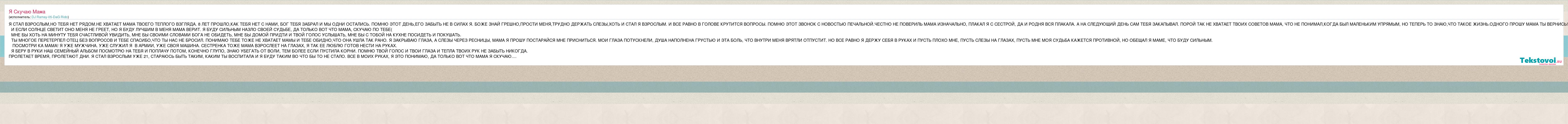 Я СТАЛ ВЗРОСЛЫМ,НО ТЕБЯ НЕТ РЯДОМ.НЕ ХВАТАЕТ МАМА ТВОЕГО ТЕПЛОГО ВЗГЛЯДА. 8 ЛЕТ ПРОШЛО,КАК ТЕБЯ НЕТ С НАМИ, БОГ ТЕБЯ ЗАБРАЛ И МЫ ОДНИ ОСТАЛИСЬ. ПОМНЮ ЭТОТ ДЕНЬ,ЕГО ЗАБЫТЬ НЕ В СИЛАХ Я. БОЖЕ ЗНАЙ ГРЕШНО,ПРОСТИ МЕНЯ,ТРУДНО ДЕРЖАТЬ СЛЕЗЫ,ХОТЬ И СТАЛ Я ВЗРОСЛЫМ. И ВСЕ РАВНО В ГОЛОВЕ КРУТИТСЯ ВОПРОСЫ. ПОМНЮ ЭТОТ ЗВОНОК С НОВОСТЬЮ ПЕЧАЛЬНОЙ.ЧЕСТНО НЕ ПОВЕРИЛЬ МАМА ИЗНАЧАЛЬНО, ПЛАКАЛ Я С СЕСТРОЙ, ДА И РОДНЯ ВСЯ ПЛАКАЛА. А НА СЛЕДУЮЩИЙ ДЕНЬ САМ ТЕБЯ ЗАКАПЫВАЛ. ПОРОЙ ТАК НЕ ХВАТАЕТ ТВОИХ СОВЕТОВ МАМА, ЧТО НЕ ПОНИМАЛ,КОГДА БЫЛ МАЛЕНЬКИМ УПРЯМЫМ, НО ТЕПЕРЬ ТО ЗНАЮ,ЧТО ТАКОЕ ЖИЗНЬ.ОДНОГО ПРОШУ МАМА ТЫ ВЕРНИСЬ! И ЕСЛИ СОЛНЦЕ СВЕТИТ ОНО МЕНЯ НЕ ГРЕЕТ, НО Я БУДУ ЛУЧШИМ В МЕНЯ МАМА ВЕРИТ. Я БУДУ СИЛЬНЫМ НАЗЛО СВОЕЙ СУДЬБЕ, ДА ТОЛЬКО ВОТ ЧТО МАМА, СКУЧАЮ ПО ТЕБЕ( МНЕ БЫ ХОТЬ НА МИНУТУ ТЕБЯ СЧАСТЛИВОЙ УВИДИТЬ, МНЕ БЫ СВОИМИ СЛОВАМИ БОГА НЕ ОБИДЕТЬ, МНЕ БЫ ДОМОЙ ПРИДТИ И ТВОЙ ГОЛОС УСЛЫШАТЬ, МНЕ БЫ С ТОБОЙ НА КУХНЕ ПОСИДЕТЬ И ПОКУШАТЬ. ТЫ МНОГОЕ ПЕРЕТЕРПЕЛ ОТЕЦ БЕЗ ВОПРОСОВ И ТЕБЕ СПАСИБО,ЧТО ТЫ НАС НЕ БРОСИЛ. ПОНИМАЮ ТЕБЕ ТОЖЕ НЕ ХВАТАЕТ МАМЫ И ТЕБЕ ОБИДНО,ЧТО ОНА УШЛА ТАК РАНО. Я ЗАКРЫВАЮ ГЛАЗА, А СЛЕЗЫ ЧЕРЕЗ РЕСНИЦЫ, МАМА Я ПРОШУ ПОСТАРАЙСЯ МНЕ ПРИСНИТЬСЯ. МОИ ГЛАЗА ПОТУСКНЕЛИ, ДУША НАПОЛНЕНА ГРУСТЬЮ И ЭТА БОЛЬ, ЧТО ВНУТРИ МЕНЯ ВРЯТЛИ ОТПУСТИТ. НО ВСЕ РАВНО Я ДЕРЖУ СЕБЯ В РУКАХ И ПУСТЬ ПЛОХО МНЕ, ПУСТЬ СЛЕЗЫ НА ГЛАЗАХ, ПУСТЬ МНЕ МОЯ СУДЬБА КАЖЕТСЯ ПРОТИВНОЙ, НО ОБЕЩАЛ Я МАМЕ, ЧТО БУДУ СИЛЬНЫМ. ПОСМОТРИ КА МАМА! Я УЖЕ МУЖЧИНА. УЖЕ СЛУЖИЛ Я В АРМИИ, УЖЕ СВОЯ МАШИНА. СЕСТРЕНКА ТОЖЕ МАМА ВЗРОСЛЕЕТ НА ГЛАЗАХ, Я ТАК ЕЕ ЛЮБЛЮ ГОТОВ НЕСТИ НА РУКАХ. Я БЕРУ В РУКИ НАШ СЕМЕЙНЫЙ АЛЬБОМ ПОСМОТРЮ НА ТЕБЯ И ПОПЛАЧУ ПОТОМ, КОНЕЧНО ГЛУПО, ЗНАЮ УБЕГАТЬ ОТ ВОЛИ, ТЕМ БОЛЕЕ ЕСЛИ ПУСТИЛА КОРНИ. ПОМНЮ ТВОЙ ГОЛОС И ТВОИ ГЛАЗА И ТЕПЛА ТВОИХ РУК НЕ ЗАБЫТЬ НИКОГДА. ПРОЛЕТАЕТ ВРЕМЯ, ПРОЛЕТАЮТ ДНИ. Я СТАЛ ВЗРОСЛЫМ УЖЕ 21, СТАРАЮСЬ БЫТЬ ТАКИМ, КАКИМ ТЫ ВОСПИТАЛА И Я БУДУ ТАКИМ ВО ЧТО БЫ ТО НЕ СТАЛО. ВСЕ В МОИХ РУКАХ, Я ЭТО ПОНИМАЮ, ДА ТОЛЬКО ВОТ ЧТО МАМА Я СКУЧАЮ....