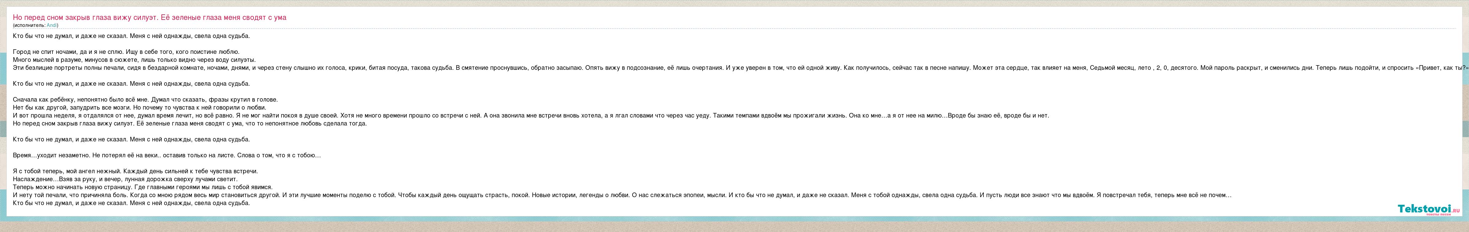 Кто бы что не думал, и даже не сказал. Меня с ней однажды, свела одна судьба. Город не спит ночами, да и я не сплю. Ищу в себе того, кого поистине люблю. Много мыслей в разуме, минусов в сюжете, лишь только видно через воду силуэты. Эти безлицие портреты полны печали, сидя в бездарной комнате, ночами, днями, и через стену слышно их голоса, крики, битая посуда, такова судьба. В смятение проснувшись, обратно засыпаю. Опять вижу в подсознание, её лишь очертания. И уже уверен в том, что ей одной живу. Как получилось, сейчас так в песне напишу. Может эта сердце, так влияет на меня, Седьмой месяц, лето , 2, 0, десятого. Мой пароль раскрыт, и сменились дни. Теперь лишь подойти, и спросить «Привет, как ты?» Кто бы что не думал, и даже не сказал. Меня с ней однажды, свела одна судьба. Сначала как ребёнку, непонятно было всё мне. Думал что сказать, фразы крутил в голове. Нет бы как другой, запудрить все мозги. Но почему то чувства к ней говорили о любви. И вот прошла неделя, я отдалялся от нее, думал время лечит, но всё равно. Я не мог найти покоя в душе своей. Хотя не много времени прошло со встречи с ней. А она звонила мне встречи вновь хотела, а я лгал словами что через час уеду. Такими темпами вдвоём мы прожигали жизнь. Она ко мне…а я от нее на милю…Вроде бы знаю её, вроде бы и нет. Но перед сном закрыв глаза вижу силуэт. Её зеленые глаза меня сводят с ума, что то непонятное любовь сделала тогда. Кто бы что не думал, и даже не сказал. Меня с ней однажды, свела одна судьба. Время…уходит незаметно. Не потерял её на веки.. оставив только на листе. Слова о том, что я с тобою… Я с тобой теперь, мой ангел нежный. Каждый день сильней к тебе чувства встречи. Наслаждение…Взяв за руку, и вечер, лунная дорожка сверху лучами светит. Теперь можно начинать новую страницу. Где главными героями мы лишь с тобой явимся. И нету той печали, что причиняла боль. Когда со мною рядом весь мир становиться другой. И эти лучшие моменты поделю с тобой. Чтобы каждый день ощущать страсть, покой. Новые истории, легенды о любви. О нас слежаться эпопеи, мысли. И кто бы что не думал, и даже не сказал. Меня с тобой однажды, свела одна судьба. И пусть люди все знают что мы вдвоём. Я повстречал тебя, теперь мне всё не почем… Кто бы что не думал, и даже не сказал. Меня с ней однажды, свела одна судьба.