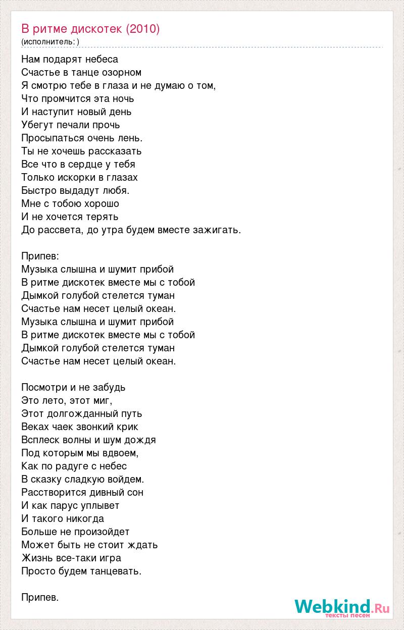 Нам подарят небеса Счастье в танце озорном Я смотрю тебе в глаза и не думаю о том, Что промчится эта ночь И наступит новый день Убегут печали прочь Просыпаться очень лень. Ты не хочешь рассказать Все что в сердце у тебя Только искорки в глазах Быстро выдадут любя. Мне с тобою хорошо И не хочется терять До рассвета, до утра будем вместе зажигать. Припев: Музыка слышна и шумит прибой В ритме дискотек вместе мы с тобой Дымкой голубой стелется туман Счастье нам несет целый океан. Музыка слышна и шумит прибой В ритме дискотек вместе мы с тобой Дымкой голубой стелется туман Счастье нам несет целый океан. Посмотри и не забудь Это лето, этот миг, Этот долгожданный путь Веках чаек звонкий крик Всплеск волны и шум дождя Под которым мы вдвоем, Как по радуге с небес В сказку сладкую войдем. Расстворится дивный сон И как парус уплывет И такого никогда Больше не произойдет Может быть не стоит ждать Жизнь все-таки игра Просто будем танцевать. Припев.