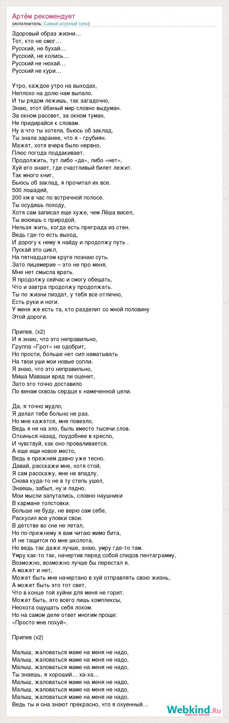 Здоровый образ жизни… Тот, кто не смог… Русский, не бухай… Русский, не колись… Русский не нюхай… Русский не кури… Утро, каждое утро на выходах, Неплохо на долю нам выпало. И ты рядом лежишь, так загадочно, Знаю, этот ёбаный мир словно выдуман. За окном рассвет, за окном туман, Не придирайся к словам. Ну а что ты хотела, бьюсь об заклад, Ты знала заранее, что я - грубиян. Мажет, хотя вчера было нервно, Плюс погода поддакивает. Продолжить, тут либо «да», либо «нет», Хуй его знает, где счастливый билет лежит. Так много книг, Бьюсь об заклад, я прочитал их все. 500 лошадей, 200 км в час по встречной полосе. Ты осудишь походу, Хотя сам записал еще хуже, чем Лёша висел, Ты воюешь с природой, Нельзя жить, когда есть преграда из стен. Ведь где-то есть выход, И дорогу к нему я найду и продолжу путь . Пускай это цикл, На пятнадцатом круге познаю суть. Зато лицемерие – это не про меня, Мне нет смысла врать. Я продолжу сейчас и смогу обещать, Что и завтра продолжу продолжать. Ты по жизни пиздат, у тебя все отлично, Есть руки и ноги. У меня же есть та, кто разделит со мной половину Этой дороги. Припев. (х2) И я знаю, что это неправильно, Группа «Грот» не одобрит, Но прости, больше нет сил наматывать На твои уши мои новые сопли. Я знаю, что это неправильно, Миша Маваши вряд ли оценит, Зато это точно доставило По венам сквозь сердце к намеченной цели. Да, я точно мудло, Я делал тебе больно не раз. Но мне кажется, мне повезло, Ведь я не на зло, быль вместо тысячи слов. Откинься назад, поудобнее в кресло, И чувствуй, как оно проваливается. А еще ищи новое место, Ведь в прежнем давно уже тесно. Давай, расскажи мне, хотя стой, Я сам расскажу, мне не впадлу, Снова куда-то не в ту степь ушел, Знаешь, забыл, ну и ладно. Мои мысли запутались, словно наушники В кармане толстовки. Больше не буду, не верю сам себе, Раскусил все уловки свои. В детстве во сне не летал, Но по-прежнему я вам читаю мимо бита, И не тащится по мне школота, Но ведь так даже лучше, знаю, умру где-то там. Умру как-то так, начертив перед собой спидов пентаграмму, Возможно, возможно лучше бы перестал я. А может и нет, Может быть мне начертано в хуй отправлять свою жизнь, А может быть это тот свет, Что в конце той хуйни для меня не горит. Может быть, это всего лишь комплексы, Неохота ощущать себя лохом. Но на самом деле ответ многим проще: «Просто мне похуй». Припев (х2) Малыш, жаловаться маме на меня не надо, Малыш, жаловаться маме на меня не надо, Малыш, жаловаться маме на меня не надо, Ты знаешь, я хороший… ха-ха… Малыш, жаловаться маме на меня не надо, Малыш, жаловаться маме на меня не надо, Малыш, жаловаться маме на меня не надо, Ведь ты и она знают прекрасно, что я охуенный…