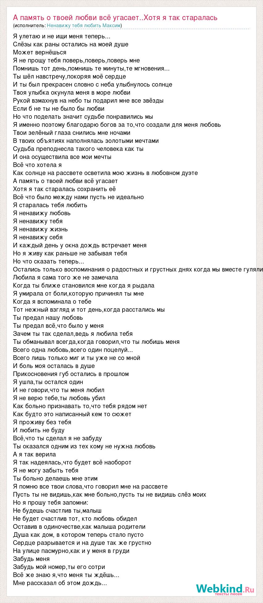 Главная→Исполнители→Ненавижу тебя любить Максим→А память о твоей любви всё угасает..Хотя я так старалась сохранить её..В