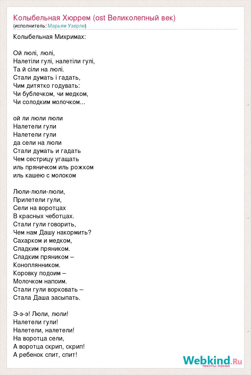 Колыбельная Михримах: Ой люлі, люлі, Налетіли гулі, налетіли гулі, Та й сіли на люлі. Стали думать і гадать, Чим дитятко годувать: Чи бублечком, чи медком, Чи солодким молочком... ой ли люли люли Налетели гули Налетели гули да сели на люли Стали думать и гадать Чем сестрицу угащать иль пряничком иль рожком иль кашею с молоком Люли-люли-люли, Прилетели гули, Сели на воротцах В красных чеботцах. Стали гули говорить, Чем нам Дашу накормить? Сахарком и медком, Сладким пряником. Сладким пряником – Коноплянником. Коровку подоим – Молочком напоим. Стали гули ворковать – Стала Даша засыпать. Э-э-э! Люли, люли! Налетели гули! Налетели, налетели! На воротца сели, А воротца скрип, скрип! А ребенок спит, спит!