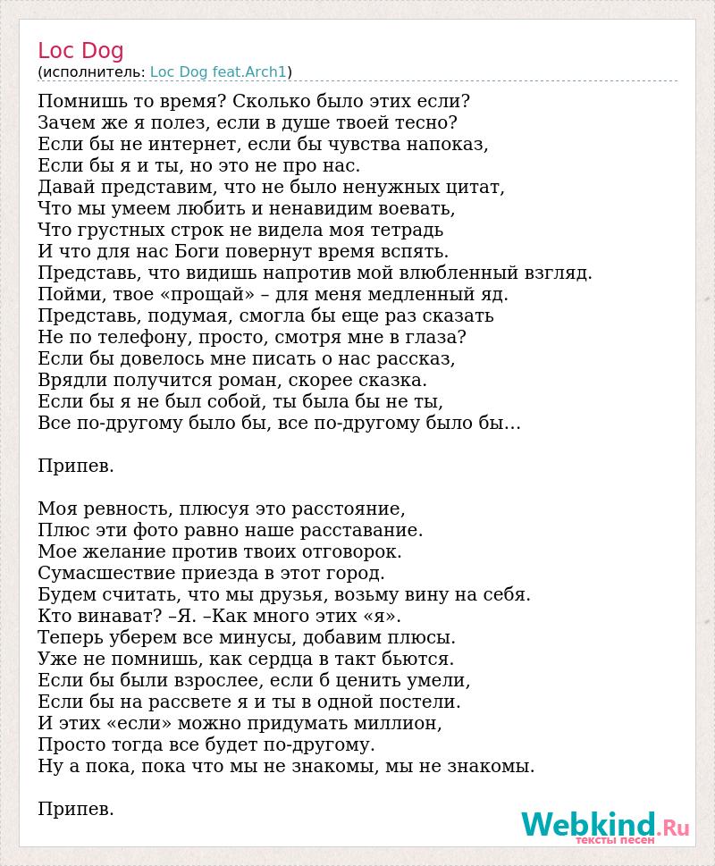 Помнишь то время? Сколько было этих если? Зачем же я полез, если в душе твоей тесно? Если бы не интернет, если бы чувства напоказ, Если бы я и ты, но это не про нас. Давай представим, что не было ненужных цитат, Что мы умеем любить и ненавидим воевать, Что грустных строк не видела моя тетрадь И что для нас Боги повернут время вспять. Представь, что видишь напротив мой влюбленный взгляд. Пойми, твое «прощай» – для меня медленный яд. Представь, подумая, смогла бы еще раз сказать Не по телефону, просто, смотря мне в глаза? Если бы довелось мне писать о нас рассказ, Врядли получится роман, скорее сказка. Если бы я не был собой, ты была бы не ты, Все по-другому было бы, все по-другому было бы… Припев. Моя ревность, плюсуя это расстояние, Плюс эти фото равно наше расставание. Мое желание против твоих отговорок. Сумасшествие приезда в этот город. Будем считать, что мы друзья, возьму вину на себя. Кто винават? –Я. –Как много этих «я». Теперь уберем все минусы, добавим плюсы. Уже не помнишь, как сердца в такт бьются. Если бы были взрослее, если б ценить умели, Если бы на рассвете я и ты в одной постели. И этих «если» можно придумать миллион, Просто тогда все будет по-другому. Ну а пока, пока что мы не знакомы, мы не знакомы. Припев.