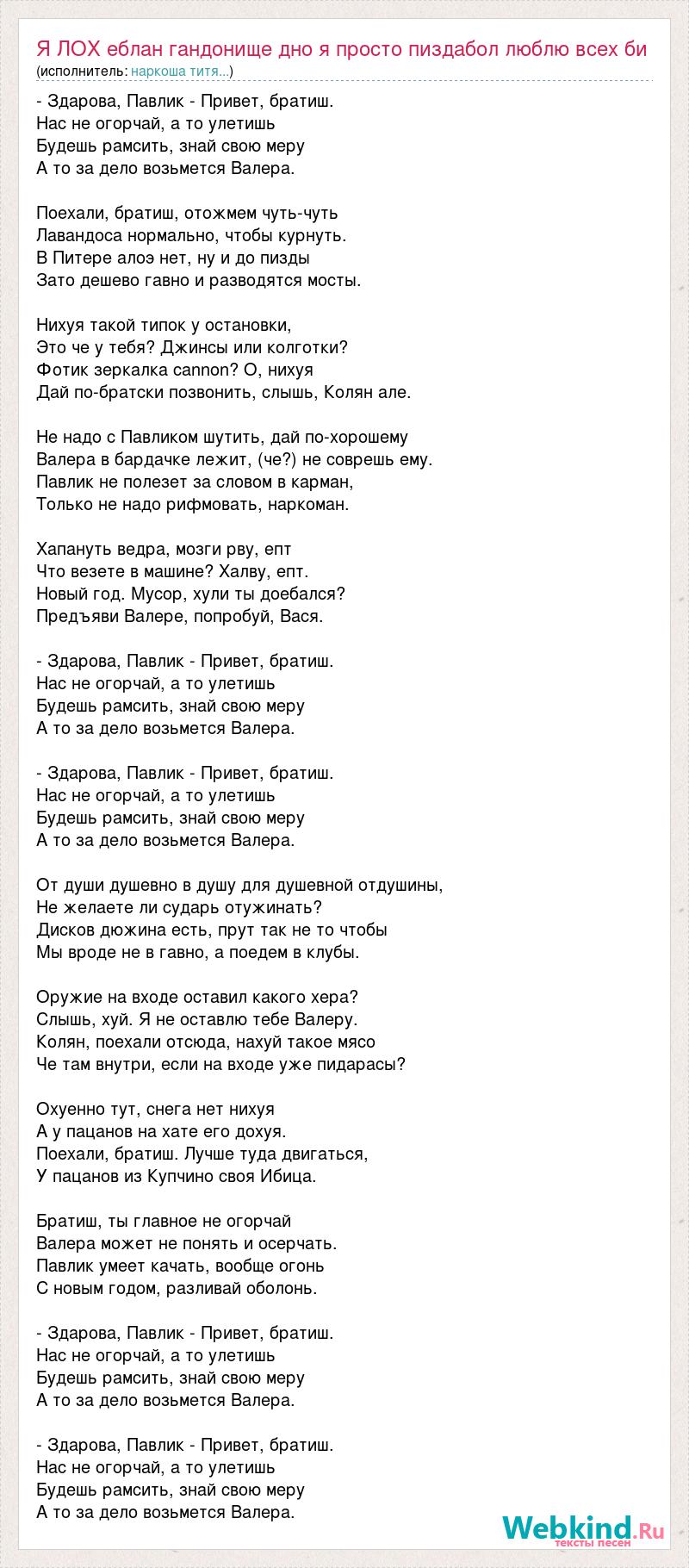 - Здарова, Павлик - Привет, братиш. Нас не огорчай, а то улетишь Будешь рамсить, знай свою меру А то за дело возьмется Валера. Поехали, братиш, отожмем чуть-чуть Лавандоса нормально, чтобы курнуть. В Питере алоэ нет, ну и до пизды Зато дешево гавно и разводятся мосты. Нихуя такой типок у остановки, Это че у тебя? Джинсы или колготки? Фотик зеркалка cannon? О, нихуя Дай по-братски позвонить, слышь, Колян але. Не надо с Павликом шутить, дай по-хорошему Валера в бардачке лежит, (че?) не соврешь ему. Павлик не полезет за словом в карман, Только не надо рифмовать, наркоман. Хапануть ведра, мозги рву, епт Что везете в машине? Халву, епт. Новый год. Мусор, хули ты доебался? Предъяви Валере, попробуй, Вася. - Здарова, Павлик - Привет, братиш. Нас не огорчай, а то улетишь Будешь рамсить, знай свою меру А то за дело возьмется Валера. - Здарова, Павлик - Привет, братиш. Нас не огорчай, а то улетишь Будешь рамсить, знай свою меру А то за дело возьмется Валера. От души душевно в душу для душевной отдушины, Не желаете ли сударь отужинать? Дисков дюжина есть, прут так не то чтобы Мы вроде не в гавно, а поедем в клубы. Оружие на входе оставил какого хера? Слышь, хуй. Я не оставлю тебе Валеру. Колян, поехали отсюда, нахуй такое мясо Че там внутри, если на входе уже пидарасы? Охуенно тут, снега нет нихуя А у пацанов на хате его дохуя. Поехали, братиш. Лучше туда двигаться, У пацанов из Купчино своя Ибица. Братиш, ты главное не огорчай Валера может не понять и осерчать. Павлик умеет качать, вообще огонь С новым годом, разливай оболонь. - Здарова, Павлик - Привет, братиш. Нас не огорчай, а то улетишь Будешь рамсить, знай свою меру А то за дело возьмется Валера. - Здарова, Павлик - Привет, братиш. Нас не огорчай, а то улетишь Будешь рамсить, знай свою меру А то за дело возьмется Валера.