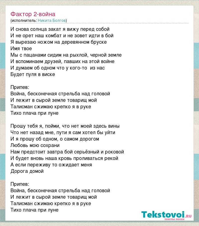 И снова солнца закат я вижу перед собой И не орет наш комбат и не зовет идти в бой Я вырезаю ножом на деревянном бруске Имя твое Мы с пацанами сидим на рыхлой, черной земле И вспоминаем друзей, павших на этой войне И думаем об одном что у кого-то из нас Будет пуля в виске Припев: Война, бесконечная стрельба над головой И лежит в сырой земле товарищ мой Талисман сжимаю крепко я в руке Тихо плача при луне Прошу тебя я, пойми, что нет моей здесь вины Что нет назад мне, пути я сам хотел бы уйти И я прошу об одном, о самом дорогом Любовь мою сохрани Нам предстоит завтра бой серьёзный и роковой И будет вновь наша кровь проливаться рекой А если переживу то ожидает меня Дорога домой Припев: Война, бесконечная стрельба над головой И лежит в сырой земле товарищ мой Талисман сжимаю крепко я в руке Тихо плача при луне