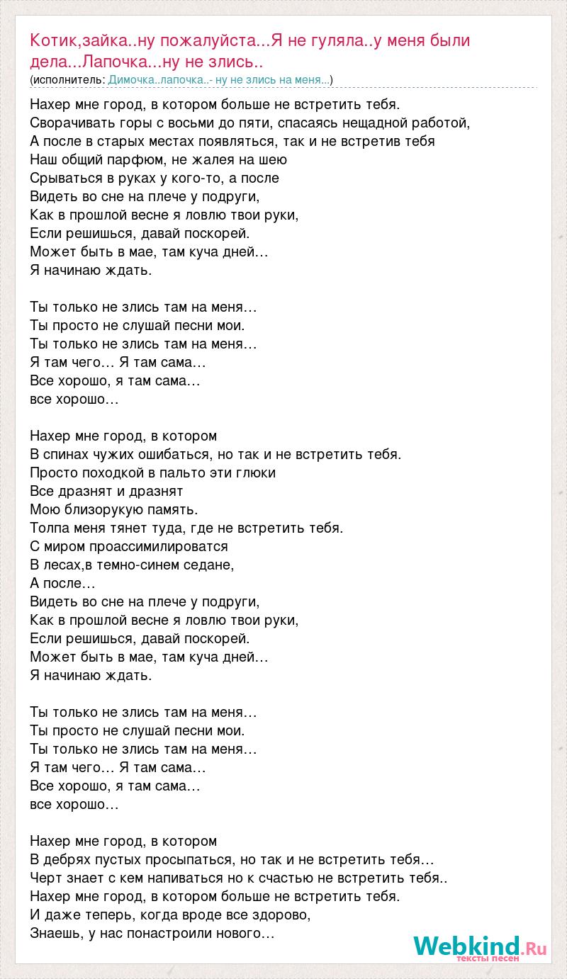Нахер мне город, в котором больше не встретить тебя. Сворачивать горы с восьми до пяти, спасаясь нещадной работой, А после в старых местах появляться, так и не встретив тебя Наш общий парфюм, не жалея на шею Срываться в руках у кого-то, а после Видеть во сне на плече у подруги, Как в прошлой весне я ловлю твои руки, Если решишься, давай поскорей. Может быть в мае, там куча дней… Я начинаю ждать. Ты только не злись там на меня… Ты просто не слушай песни мои. Ты только не злись там на меня… Я там чего… Я там сама… Все хорошо, я там сама… все хорошо… Нахер мне город, в котором В спинах чужих ошибаться, но так и не встретить тебя. Просто походкой в пальто эти глюки Все дразнят и дразнят Мою близорукую память. Толпа меня тянет туда, где не встретить тебя. С миром проассимилироватся В лесах,в темно-синем седане, А после… Видеть во сне на плече у подруги, Как в прошлой весне я ловлю твои руки, Если решишься, давай поскорей. Может быть в мае, там куча дней… Я начинаю ждать. Ты только не злись там на меня… Ты просто не слушай песни мои. Ты только не злись там на меня… Я там чего… Я там сама… Все хорошо, я там сама… все хорошо… Нахер мне город, в котором В дебрях пустых просыпаться, но так и не встретить тебя… Черт знает с кем напиваться но к счастью не встретить тебя.. Нахер мне город, в котором больше не встретить тебя. И даже теперь, когда вроде все здорово, Знаешь, у нас понастроили нового…
