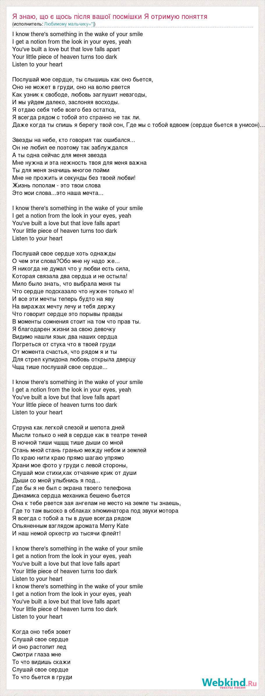 I know there's something in the wake of your smile I get a notion from the look in your eyes, yeah You've built a love but that love falls apart Your little piece of heaven turns too dark Listen to your heart Послушай мое сердце, ты слышишь как оно бьется, Оно не может в груди, оно на волю рвется Как узник к свободе, любовь заглушит невзгоды, И мы уйдем далеко, заслоняя восходы. Я отдаю себя тебе всего без остатка, Я всегда рядом с тобой это странно не так ли. Даже когда ты спишь я берегу твой сон, Где мы с тобой вдвоем (сердце бьется в унисон)... Звезды на небе, кто говорил так ошибался... Он не любил ее поэтому так заблуждался А ты одна сейчас для меня звезда Мне нужна и эта нежность твоя для меня важна Ты для меня значишь многое пойми Мне не прожить и секунды без твоей любви! Жизнь пополам - это твои слова Это мои слова...это наша мечта... I know there's something in the wake of your smile I get a notion from the look in your eyes, yeah You've built a love but that love falls apart Your little piece of heaven turns too dark Listen to your heart Послушай свое сердце хоть однажды О чем эти слова?Обо мне ну надо же... Я никогда не думал что у любви есть сила, Которая связала два сердца и не остыла! Мило было знать, что выбрала меня ты Что сердце подсказало что нужен только я! И все эти мечты теперь будто на яву На виражах мечту лечу и тебя держу Что говорит сердце это порывы правды В моменты сомнения стоит на том что прав ты. Я благодарен жизни за свою девочку Видимо нашли язык два наших сердца Погреться от стука что в твоей груди От момента счастья, что рядом я и ты Для стрел купидона любовь открыла дверцу Чщщ тише послушай свое сердце... I know there's something in the wake of your smile I get a notion from the look in your eyes, yeah You've built a love but that love falls apart Your little piece of heaven turns too dark Listen to your heart Струна как легкой слезой и шепота дней Мысли только о ней в сердце как в театре теней В ночной тиши чщщщ тише дыши со мной Стань мной стань гранью между небом и землей По краю нити краю прямо шагаю упрямо Храни мое фото у груди с левой стороны, Слушай мои стихи,как отчаяние крик от души Дыши со мной улыбнись я под... Где бы я не был с экрана твоего телефона Динамика сердца механика бешено бьется Она к тебе рвется зая ангелам не место на земле ты знаешь, Где то там высоко в облаках элюминатора под звуки мотора Я всегда с тобой а ты в душе всегда рядом Опьяненным взглядом аромата Merry Kate И наш немой оркестр из тысячи флейт! I know there's something in the wake of your smile I get a notion from the look in your eyes, yeah You've built a love but that love falls apart Your little piece of heaven turns too dark Listen to your heart I know there's something in the wake of your smile I get a notion from the look in your eyes, yeah You've built a love but that love falls apart Your little piece of heaven turns too dark Listen to your heart Когда оно тебя зовет Слушай свое сердце И оно растопит лед Смотри глаза мне То что видишь скажи Слушай свое сердце То что бьется в груди