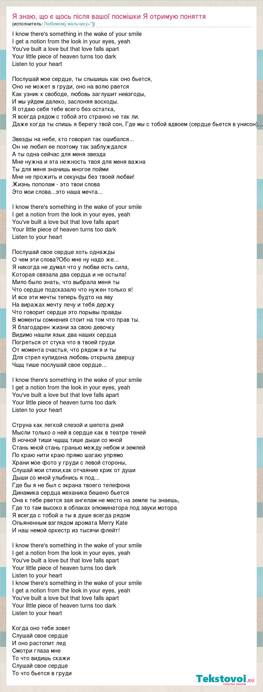 I know there's something in the wake of your smile I get a notion from the look in your eyes, yeah You've built a love but that love falls apart Your little piece of heaven turns too dark Listen to your heart Послушай мое сердце, ты слышишь как оно бьется, Оно не может в груди, оно на волю рвется Как узник к свободе, любовь заглушит невзгоды, И мы уйдем далеко, заслоняя восходы. Я отдаю себя тебе всего без остатка, Я всегда рядом с тобой это странно не так ли. Даже когда ты спишь я берегу твой сон, Где мы с тобой вдвоем (сердце бьется в унисон)... Звезды на небе, кто говорил так ошибался... Он не любил ее поэтому так заблуждался А ты одна сейчас для меня звезда Мне нужна и эта нежность твоя для меня важна Ты для меня значишь многое пойми Мне не прожить и секунды без твоей любви! Жизнь пополам - это твои слова Это мои слова...это наша мечта... I know there's something in the wake of your smile I get a notion from the look in your eyes, yeah You've built a love but that love falls apart Your little piece of heaven turns too dark Listen to your heart Послушай свое сердце хоть однажды О чем эти слова?Обо мне ну надо же... Я никогда не думал что у любви есть сила, Которая связала два сердца и не остыла! Мило было знать, что выбрала меня ты Что сердце подсказало что нужен только я! И все эти мечты теперь будто на яву На виражах мечту лечу и тебя держу Что говорит сердце это порывы правды В моменты сомнения стоит на том что прав ты. Я благодарен жизни за свою девочку Видимо нашли язык два наших сердца Погреться от стука что в твоей груди От момента счастья, что рядом я и ты Для стрел купидона любовь открыла дверцу Чщщ тише послушай свое сердце... I know there's something in the wake of your smile I get a notion from the look in your eyes, yeah You've built a love but that love falls apart Your little piece of heaven turns too dark Listen to your heart Струна как легкой слезой и шепота дней Мысли только о ней в сердце как в театре теней В ночной тиши чщщщ тише дыши со мной Стань мной стань гранью между небом и землей По краю нити краю прямо шагаю упрямо Храни мое фото у груди с левой стороны, Слушай мои стихи,как отчаяние крик от души Дыши со мной улыбнись я под... Где бы я не был с экрана твоего телефона Динамика сердца механика бешено бьется Она к тебе рвется зая ангелам не место на земле ты знаешь, Где то там высоко в облаках элюминатора под звуки мотора Я всегда с тобой а ты в душе всегда рядом Опьяненным взглядом аромата Merry Kate И наш немой оркестр из тысячи флейт! I know there's something in the wake of your smile I get a notion from the look in your eyes, yeah You've built a love but that love falls apart Your little piece of heaven turns too dark Listen to your heart I know there's something in the wake of your smile I get a notion from the look in your eyes, yeah You've built a love but that love falls apart Your little piece of heaven turns too dark Listen to your heart Когда оно тебя зовет Слушай свое сердце И оно растопит лед Смотри глаза мне То что видишь скажи Слушай свое сердце То что бьется в груди