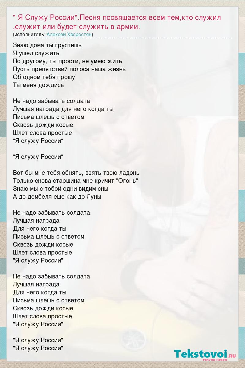 Знаю дома ты грустишь Я ушел служить По другому, ты прости, не умею жить Пусть препятствий полоса наша жизнь Об одном тебя прошу Ты меня дождись Не надо забывать солдата Лучшая награда для него когда ты Письма шлешь с ответом Сквозь дожди косые Шлет слова простые "Я служу России" "Я служу России" Вот бы мне тебя обнять, взять твою ладонь Только снова старшина мне кричит "Огонь" Знаю мы с тобой одни видим сны А до дембеля еще как до Луны Не надо забывать солдата Лучшая награда Для него когда ты Письма шлешь с ответом Сквозь дожди косые Шлет слова простые "Я служу России" Не надо забывать солдата Лучшая награда Для него когда ты Письма шлешь с ответом Сквозь дожди косые Шлет слова простые "Я служу России" "Я служу России" "Я служу России"