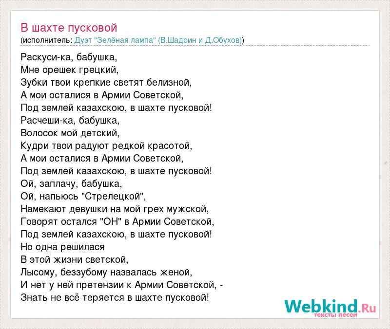 Раскуси-ка, бабушка, Мне орешек грецкий, Зубки твои крепкие светят белизной, А мои осталися в Армии Советской, Под землей казахскою, в шахте пусковой! Расчеши-ка, бабушка, Волосок мой детский, Кудри твои радуют редкой красотой, А мои осталися в Армии Советской, Под землей казахскою, в шахте пусковой! Ой, заплачу, бабушка, Ой, напьюсь "Стрелецкой", Намекают девушки на мой грех мужской, Говорят остался "ОН" в Армии Советской, Под землей казахскою, в шахте пусковой! Но одна решилася В этой жизни светской, Лысому, беззубому назвалась женой, И нет у ней претензии к Армии Советской, - Знать не всё теряется в шахте пусковой!