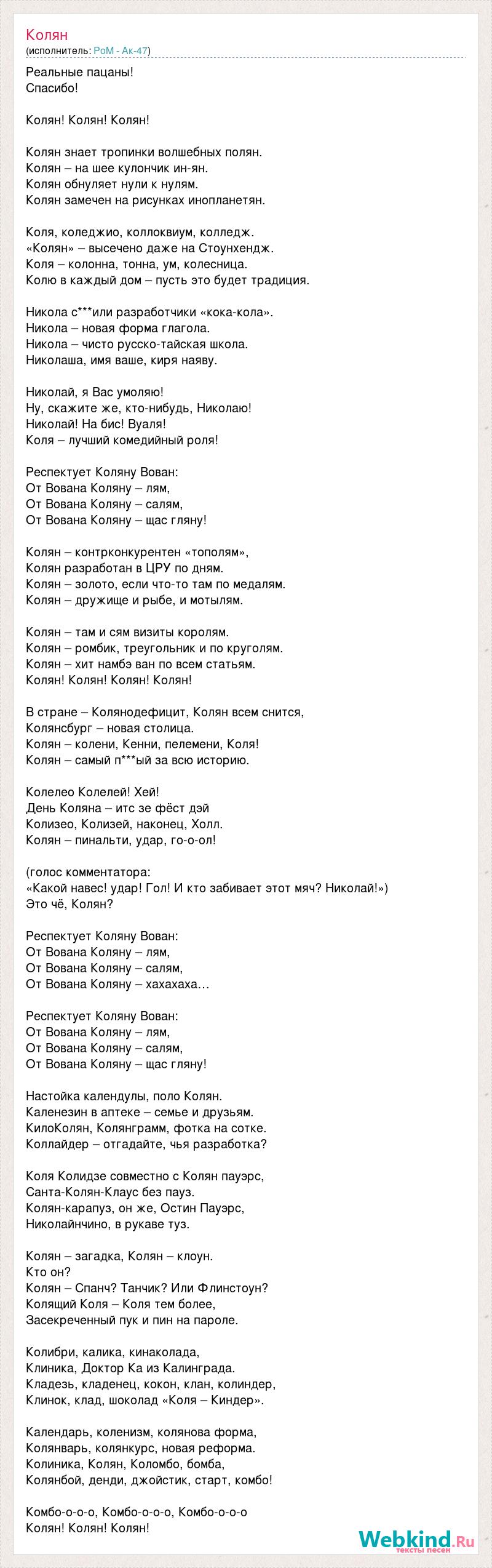 Реальные пацаны! Спасибо! Колян! Колян! Колян! Колян знает тропинки волшебных полян. Колян – на шее кулончик ин-ян. Колян обнуляет нули к нулям. Колян замечен на рисунках инопланетян. Коля, коледжио, коллоквиум, колледж. «Колян» – высечено даже на Стоунхендж. Коля – колонна, тонна, ум, колесница. Колю в каждый дом – пусть это будет традиция. Никола с***или разработчики «кока-кола». Никола – новая форма глагола. Никола – чисто русско-тайская школа. Николаша, имя ваше, киря наяву. Николай, я Вас умоляю! Ну, скажите же, кто-нибудь, Николаю! Николай! На бис! Вуаля! Коля – лучший комедийный роля! Респектует Коляну Вован: От Вована Коляну – лям, От Вована Коляну – салям, От Вована Коляну – щас гляну! Колян – контрконкурентен «тополям», Колян разработан в ЦРУ по дням. Колян – золото, если что-то там по медалям. Колян – дружище и рыбе, и мотылям. Колян – там и сям визиты королям. Колян – ромбик, треугольник и по круголям. Колян – хит намбэ ван по всем статьям. Колян! Колян! Колян! Колян! В стране – Колянодефицит, Колян всем снится, Колянсбург – новая столица. Колян – колени, Кенни, пелемени, Коля! Колян – самый п***ый за всю историю. Колелео Колелей! Хей! День Коляна – итс зе фёст дэй Колизео, Колизей, наконец, Холл. Колян – пинальти, удар, го-о-ол! (голос комментатора: «Какой навес! удар! Гол! И кто забивает этот мяч? Николай!») Это чё, Колян? Респектует Коляну Вован: От Вована Коляну – лям, От Вована Коляну – салям, От Вована Коляну – хахахаха… Респектует Коляну Вован: От Вована Коляну – лям, От Вована Коляну – салям, От Вована Коляну – щас гляну! Настойка календулы, поло Колян. Каленезин в аптеке – семье и друзьям. КилоКолян, Колянграмм, фотка на сотке. Коллайдер – отгадайте, чья разработка? Коля Колидзе совместно с Колян пауэрс, Санта-Колян-Клаус без пауз. Колян-карапуз, он же, Остин Пауэрс, Николайнчино, в рукаве туз. Колян – загадка, Колян – клоун. Кто он? Колян – Спанч? Танчик? Или Флинстоун? Колящий Коля – Коля тем более, Засекреченный пук и пин на пароле. Колибри, калика, кинаколада, Клиника, Доктор Ка из Калинграда. Кладезь, кладенец, кокон, клан, колиндер, Клинок, клад, шоколад «Коля – Киндер». Календарь, коленизм, колянова форма, Колянварь, колянкурс, новая реформа. Колиника, Колян, Коломбо, бомба, Колянбой, денди, джойстик, старт, комбо! Комбо-о-о-о, Комбо-о-о-о, Комбо-о-о-о Колян! Колян! Колян!