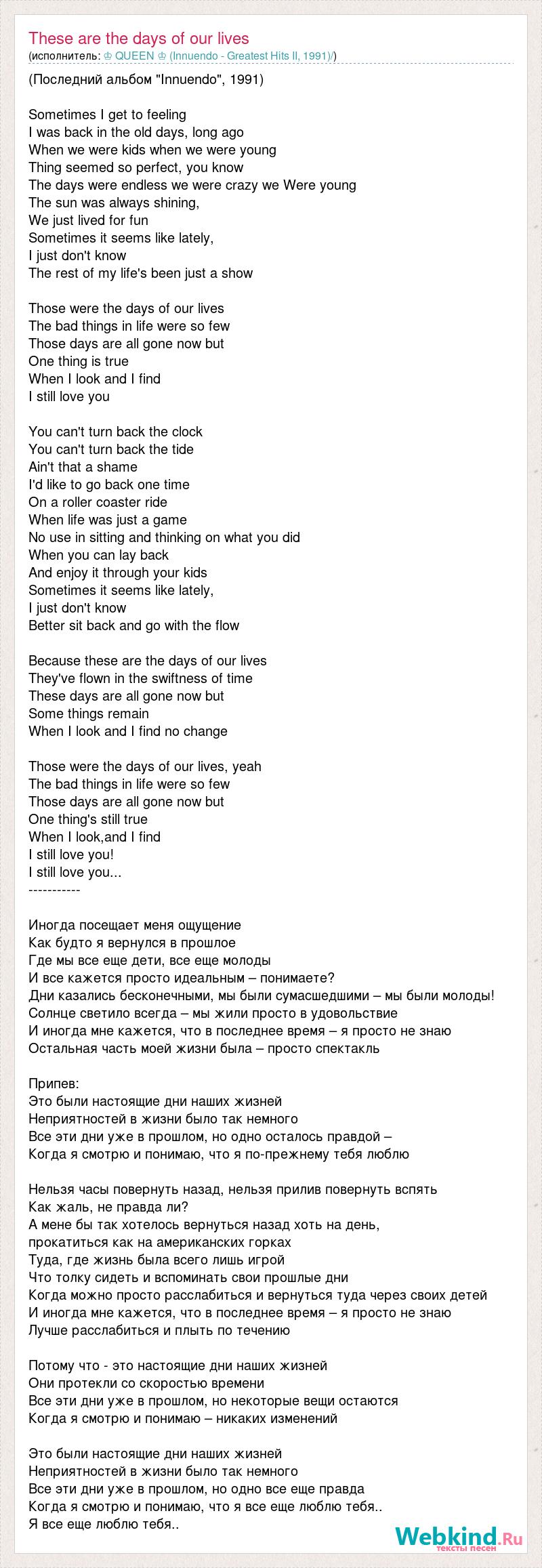 (Последний альбом "Innuendo", 1991) Sometimes I get to feeling I was back in the old days, long ago When we were kids when we were young Thing seemed so perfect, you know The days were endless we were crazy we Were young The sun was always shining, We just lived for fun Sometimes it seems like lately, I just don't know The rest of my life's been just a show Those were the days of our lives The bad things in life were so few Those days are all gone now but One thing is true When I look and I find I still love you You can't turn back the clock You can't turn back the tide Ain't that a shame I'd like to go back one time On a roller coaster ride When life was just a game No use in sitting and thinking on what you did When you can lay back And enjoy it through your kids Sometimes it seems like lately, I just don't know Better sit back and go with the flow Because these are the days of our lives They've flown in the swiftness of time These days are all gone now but Some things remain When I look and I find no change Those were the days of our lives, yeah The bad things in life were so few Those days are all gone now but One thing's still true When I look,and I find I still love you! I still love you... ----------- Иногда посещает меня ощущение Как будто я вернулся в прошлое Где мы все еще дети, все еще молоды И все кажется просто идеальным – понимаете? Дни казались бесконечными, мы были сумасшедшими – мы были молоды! Солнце светило всегда – мы жили просто в удовольствие И иногда мне кажется, что в последнее время – я просто не знаю Остальная часть моей жизни была – просто спектакль Припев: Это были настоящие дни наших жизней Неприятностей в жизни было так немного Все эти дни уже в прошлом, но одно осталось правдой – Когда я смотрю и понимаю, что я по-прежнему тебя люблю Нельзя часы повернуть назад, нельзя прилив повернуть вспять Как жаль, не правда ли? А мене бы так хотелось вернуться назад хоть на день, прокатиться как на американских горках Туда, где жизнь была всего лишь игрой Что толку сидеть и вспоминать свои прошлые дни Когда можно просто расслабиться и вернуться туда через своих детей И иногда мне кажется, что в последнее время – я просто не знаю Лучше расслабиться и плыть по течению Потому что - это настоящие дни наших жизней Они протекли со скоростью времени Все эти дни уже в прошлом, но некоторые вещи остаются Когда я смотрю и понимаю – никаких изменений Это были настоящие дни наших жизней Неприятностей в жизни было так немного Все эти дни уже в прошлом, но одно все еще правда Когда я смотрю и понимаю, что я все еще люблю тебя.. Я все еще люблю тебя..