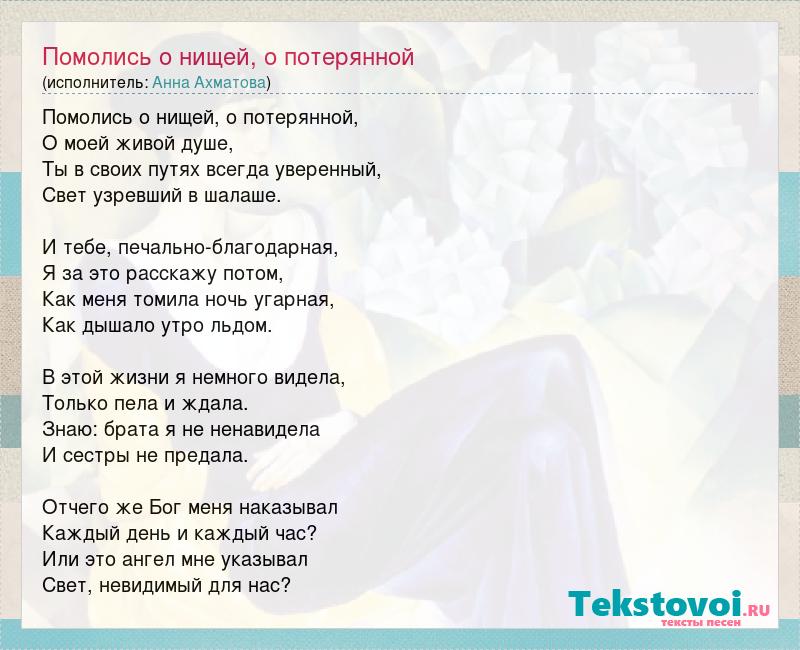 Помолись о нищей, о потерянной, О моей живой душе, Ты в своих путях всегда уверенный, Свет узревший в шалаше. И тебе, печально-благодарная, Я за это расскажу потом, Как меня томила ночь угарная, Как дышало утро льдом. В этой жизни я немного видела, Только пела и ждала. Знаю: брата я не ненавидела И сестры не предала. Отчего же Бог меня наказывал Каждый день и каждый час? Или это ангел мне указывал Свет, невидимый для нас?