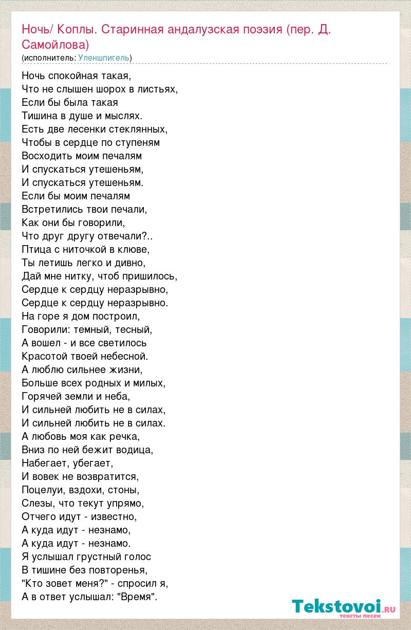 Ночь спокойная такая, Что не слышен шорох в листьях, Если бы была такая Тишина в душе и мыслях. Есть две лесенки стеклянных, Чтобы в сердце по ступеням Восходить моим печалям И спускаться утешеньям, И спускаться утешеньям. Если бы моим печалям Встретились твои печали, Как они бы говорили, Что друг другу отвечали?.. Птица с ниточкой в клюве, Ты летишь легко и дивно, Дай мне нитку, чтоб пришилось, Сердце к сердцу неразрывно, Сердце к сердцу неразрывно. На горе я дом построил, Говорили: темный, тесный, А вошел - и все светилось Красотой твоей небесной. А люблю сильнее жизни, Больше всех родных и милых, Горячей земли и неба, И сильней любить не в силах, И сильней любить не в силах. А любовь моя как речка, Вниз по ней бежит водица, Набегает, убегает, И вовек не возвратится, Поцелуи, вздохи, стоны, Слезы, что текут упрямо, Отчего идут - известно, А куда идут - незнамо, А куда идут - незнамо. Я услышал грустный голос В тишине без повторенья, "Кто зовет меня?" - спросил я, А в ответ услышал: "Время".