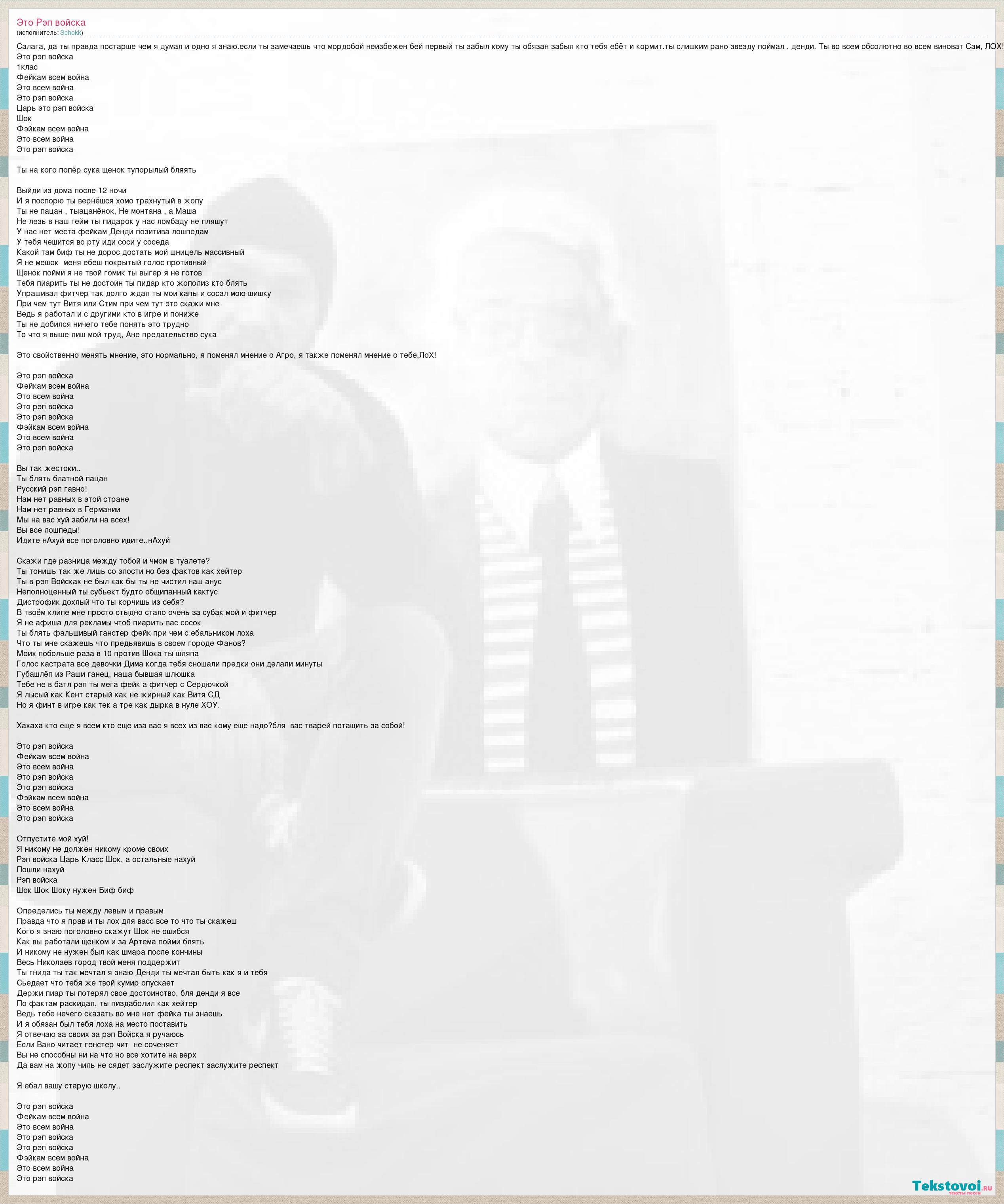 Салага, да ты правда постарше чем я думал и одно я знаю.если ты замечаешь что мордобой неизбежен бей первый ты забыл кому ты обязан забыл кто тебя ебёт и кормит.ты слишким рано звезду поймал , денди. Ты во всем обсолютно во всем виноват Сам, ЛОХ! Это рэп войска 1клас Фейкам всем война Это всем война Это рэп войска Царь это рэп войска Шок Фэйкам всем война Это всем война Это рэп войска Ты на кого попёр сука щенок тупорылый бляять Выйди из дома после 12 ночи И я поспорю ты вернёшся хомо трахнутый в жопу Ты не пацан , тыацанёнок, Не монтана , а Маша Не лезь в наш гейм ты пидарок у нас ломбаду не пляшут У нас нет места фейкам Денди позитива лошпедам У тебя чешится во рту иди соси у соседа Какой там биф ты не дорос достать мой шницель массивный Я не мешок меня ебеш покрытый голос противный Щенок пойми я не твой гомик ты выгер я не готов Тебя пиарить ты не достоин ты пидар кто жополиз кто блять Упрашивал фитчер так долго ждал ты мои капы и сосал мою шишку При чем тут Витя или Стим при чем тут это скажи мне Ведь я работал и с другими кто в игре и пониже Ты не добился ничего тебе понять это трудно То что я выше лиш мой труд, Ане предательство сука Это свойственно менять мнение, это нормально, я поменял мнение о Агро, я также поменял мнение о тебе,ЛоХ! Это рэп войска Фейкам всем война Это всем война Это рэп войска Это рэп войска Фэйкам всем война Это всем война Это рэп войска Вы так жестоки.. Ты блять блатной пацан Русский рэп гавно! Нам нет равных в этой стране Нам нет равных в Германии Мы на вас хуй забили на всех! Вы все лошпеды! Идите нАхуй все поголовно идите..нАхуй Скажи где разница между тобой и чмом в туалете? Ты тонишь так же лишь со злости но без фактов как хейтер Ты в рэп Войсках не был как бы ты не чистил наш анус Неполноценный ты субьект будто общипанный кактус Дистрофик дохлый что ты корчишь из себя? В твоём клипе мне просто стыдно стало очень за субак мой и фитчер Я не афиша для рекламы чтоб пиарить вас сосок Ты блять фальшивый ганстер фейк при чем с ебальником лоха Что ты мне скажешь что предьявишь в своем городе Фанов? Моих побольше раза в 10 против Шока ты шляпа Голос кастрата все девочки Дима когда тебя сношали предки они делали минуты Губашлёп из Раши ганец, наша бывшая шлюшка Тебе не в батл рэп ты мега фейк а фитчер с Сердючкой Я лысый как Кент старый как не жирный как Витя СД Но я финт в игре как тек а тре как дырка в нуле ХОУ. Хахаха кто еще я всем кто еще иза вас я всех из вас кому еще надо?бля вас тварей потащить за собой! Это рэп войска Фейкам всем война Это всем война Это рэп войска Это рэп войска Фэйкам всем война Это всем война Это рэп войска Отпустите мой хуй! Я никому не должен никому кроме своих Рэп войска Царь Класс Шок, а остальные нахуй Пошли нахуй Рэп войска Шок Шок Шоку нужен Биф биф Определись ты между левым и правым Правда что я прав и ты лох для васс все то что ты скажеш Кого я знаю поголовно скажут Шок не ошибся Как вы работали щенком и за Артема пойми блять И никому не нужен был как шмара после кончины Весь Николаев город твой меня поддержит Ты гнида ты так мечтал я знаю Денди ты мечтал быть как я и тебя Сьедает что тебя же твой кумир опускает Держи пиар ты потерял свое достоинство, бля денди я все По фактам раскидал, ты пиздаболил как хейтер Ведь тебе нечего сказать во мне нет фейка ты знаешь И я обязан был тебя лоха на место поставить Я отвечаю з
