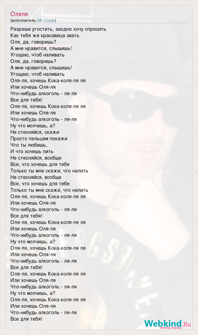 Разреши угостить, заодно хочу спросить Как тебя же красавица звать Оля, да, говоришь? А мне нравится, слышишь! Угощаю, чтоб наливать Оля, да, говоришь? А мне нравится, слышишь! Угощаю, чтоб наливать Оля-ля, хочешь Кока-коля-ля ля Или хочешь Оля-ля Что-нибудь алкоголь - ля-ля Все для тебя! Оля-ля, хочешь Кока-коля-ля ля Или хочешь Оля-ля Что-нибудь алкоголь - ля-ля Ну что молчишь, а? Не стесняйся, скажи Просто пальцем покажи Что ты любишь, И что хочешь пить Не стесняйся, вообще Все, что хочешь для тебе Только ты мне скажи, что налить Не стесняйся, вообще Все, что хочешь для тебе Только ты мне скажи, что налить Оля-ля, хочешь Кока-коля-ля ля Или хочешь Оля-ля Что-нибудь алкоголь - ля-ля Все для тебя! Оля-ля, хочешь Кока-коля-ля ля Или хочешь Оля-ля Что-нибудь алкоголь - ля-ля Ну что молчишь, а? Оля-ля, хочешь Кока-коля-ля ля Или хочешь Оля-ля Что-нибудь алкоголь - ля-ля Все для тебя! Оля-ля, хочешь Кока-коля-ля ля Или хочешь Оля-ля Что-нибудь алкоголь - ля-ля Ну что молчишь, а? Оля-ля, хочешь Кока-коля-ля ля Или хочешь Оля-ля Что-нибудь алкоголь - ля-ля Все для тебя!