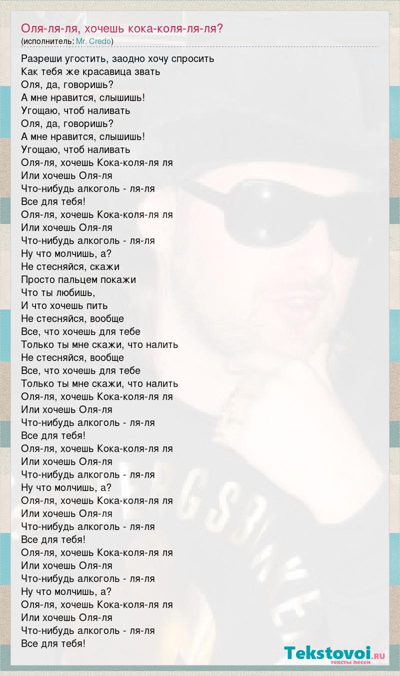 Разреши угостить, заодно хочу спросить Как тебя же красавица звать Оля, да, говоришь? А мне нравится, слышишь! Угощаю, чтоб наливать Оля, да, говоришь? А мне нравится, слышишь! Угощаю, чтоб наливать Оля-ля, хочешь Кока-коля-ля ля Или хочешь Оля-ля Что-нибудь алкоголь - ля-ля Все для тебя! Оля-ля, хочешь Кока-коля-ля ля Или хочешь Оля-ля Что-нибудь алкоголь - ля-ля Ну что молчишь, а? Не стесняйся, скажи Просто пальцем покажи Что ты любишь, И что хочешь пить Не стесняйся, вообще Все, что хочешь для тебе Только ты мне скажи, что налить Не стесняйся, вообще Все, что хочешь для тебе Только ты мне скажи, что налить Оля-ля, хочешь Кока-коля-ля ля Или хочешь Оля-ля Что-нибудь алкоголь - ля-ля Все для тебя! Оля-ля, хочешь Кока-коля-ля ля Или хочешь Оля-ля Что-нибудь алкоголь - ля-ля Ну что молчишь, а? Оля-ля, хочешь Кока-коля-ля ля Или хочешь Оля-ля Что-нибудь алкоголь - ля-ля Все для тебя! Оля-ля, хочешь Кока-коля-ля ля Или хочешь Оля-ля Что-нибудь алкоголь - ля-ля Ну что молчишь, а? Оля-ля, хочешь Кока-коля-ля ля Или хочешь Оля-ля Что-нибудь алкоголь - ля-ля Все для тебя!