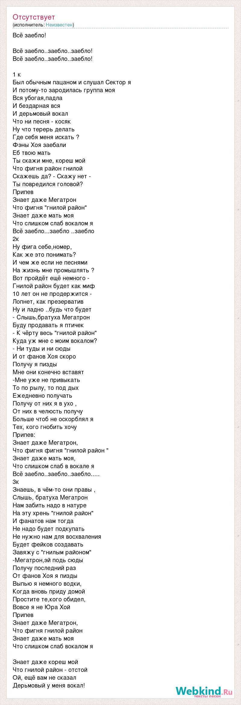 Всё заебло! Всё заебло..заебло..заебло! Всё заебло..заебло..заебло! 1 к Был обычным пацаном и слушал Сектор я И потому-то зародилась группа моя Вся убогая,падла И бездарная вся И дерьмовый вокал Что ни песня - косяк Ну что терерь делать Где себя меня искать ? Фэны Хоя заебали Еб твою мать Ты скажи мне, кореш мой Что фигня район гнилой Скажешь да? - Скажу нет - Ты повредился головой? Припев Знает даже Мегатрон Что фигня "гнилой район" Знает даже мать моя Что слишком слаб вокалом я Всё заебло...заебло ..заебло 2к Ну фига себе,номер, Как же это понимать? И чем же если не песнями На жизнь мне промышлять ? Вот пройдёт ещё немного - Гнилой район будет как миф 10 лет он не продержится - Лопнет, как презерватив Ну и ладно ..будь что будет - Слышь,братуха Мегатрон Буду продавать я птичек - К чёрту весь "гнилой район" Куда уж мне с моим вокалом? - Ни туды и ни сюды И от фанов Хоя скоро Получу я пизды Мне они конечно вставят -Мне уже не привыкать То по рылу, то под дых Ежедневно получать Получу от них я в ухо , От них в челюсть получу Больше чтоб не оскорблял я Тех, кого гнобить хочу Припев: Знает даже Мегатрон, Что фигня фигня "гнилой район " Знает даже мать моя, Что слишком слаб в вокале я Всё заебло..заебло..заебло..... 3к Знаешь, в чём-то они правы , Слышь, братуха Мегатрон Нам забить надо в натуре На эту хрень "гнилой район" И фанатов нам тогда Не надо будет подкупать Не нужно нам для восхваления Будет фейков создавать Завяжу с "гнилым районом" -Мегатрон,эй подь сюды Получу последний раз От фанов Хоя я пизды Выпью я немного водки, Когда вновь приду домой Простите те,кого обидел, Вовсе я не Юра Хой Припев Знает даже Мегатрон, Что фигня гнилой район Знает даже мать моя Что слишком слаб вокалом я Знает даже кореш мой Что гнилой район - отстой Ой, ещё вам не сказал Дерьмовый у меня вокал!