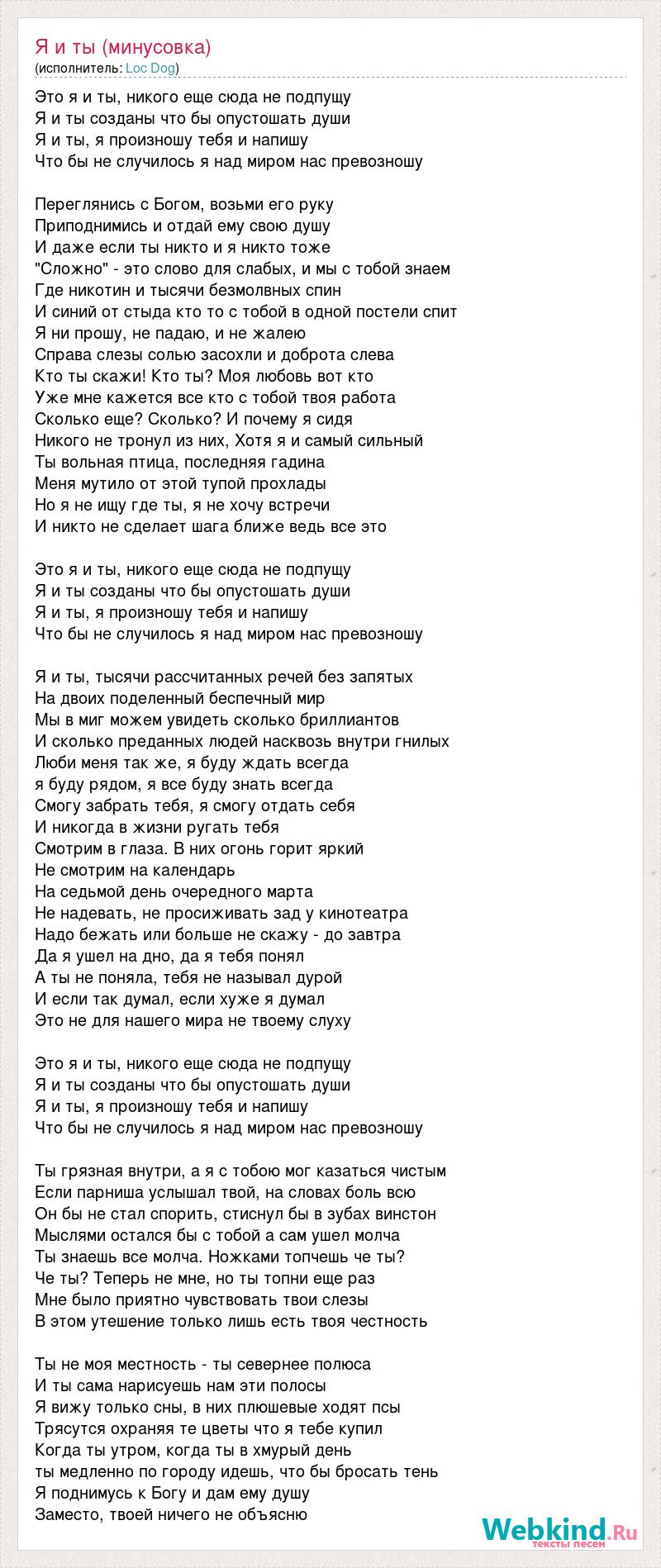 Это я и ты, никого еще сюда не подпущу Я и ты созданы что бы опустошать души Я и ты, я произношу тебя и напишу Что бы не случилось я над миром нас превозношу Переглянись с Богом, возьми его руку Приподнимись и отдай ему свою душу И даже если ты никто и я никто тоже "Сложно" - это слово для слабых, и мы с тобой знаем Где никотин и тысячи безмолвных спин И синий от стыда кто то с тобой в одной постели спит Я ни прошу, не падаю, и не жалею Справа слезы солью засохли и доброта слева Кто ты скажи! Кто ты? Моя любовь вот кто Уже мне кажется все кто с тобой твоя работа Сколько еще? Сколько? И почему я сидя Никого не тронул из них, Хотя я и самый сильный Ты вольная птица, последняя гадина Меня мутило от этой тупой прохлады Но я не ищу где ты, я не хочу встречи И никто не сделает шага ближе ведь все это Это я и ты, никого еще сюда не подпущу Я и ты созданы что бы опустошать души Я и ты, я произношу тебя и напишу Что бы не случилось я над миром нас превозношу Я и ты, тысячи рассчитанных речей без запятых На двоих поделенный беспечный мир Мы в миг можем увидеть сколько бриллиантов И сколько преданных людей насквозь внутри гнилых Люби меня так же, я буду ждать всегда я буду рядом, я все буду знать всегда Смогу забрать тебя, я смогу отдать себя И никогда в жизни ругать тебя Смотрим в глаза. В них огонь горит яркий Не смотрим на календарь На седьмой день очередного марта Не надевать, не просиживать зад у кинотеатра Надо бежать или больше не скажу - до завтра Да я ушел на дно, да я тебя понял А ты не поняла, тебя не называл дурой И если так думал, если хуже я думал Это не для нашего мира не твоему слуху Это я и ты, никого еще сюда не подпущу Я и ты созданы что бы опустошать души Я и ты, я произношу тебя и напишу Что бы не случилось я над миром нас превозношу Ты грязная внутри, а я с тобою мог казаться чистым Если парниша услышал твой, на словах боль всю Он бы не стал спорить, стиснул бы в зубах винстон Мыслями остался бы с тобой а сам ушел молча Ты знаешь все молча. Ножками топчешь че ты? Че ты? Теперь не мне, но ты топни еще раз Мне было приятно чувствовать твои слезы В этом утешение только лишь есть твоя честность Ты не моя местность - ты севернее полюса И ты сама нарисуешь нам эти полосы Я вижу только сны, в них плюшевые ходят псы Трясутся охраняя те цветы что я тебе купил Когда ты утром, когда ты в хмурый день ты медленно по городу идешь, что бы бросать тень Я поднимусь к Богу и дам ему душу Заместо, твоей ничего не объясню