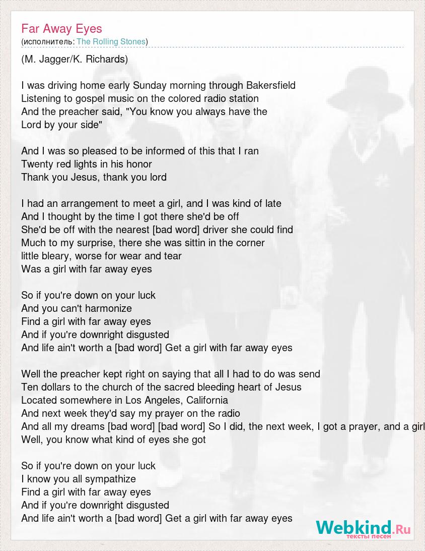 (M. Jagger/K. Richards) I was driving home early Sunday morning through Bakersfield Listening to gospel music on the colored radio station And the preacher said, "You know you always have the Lord by your side" And I was so pleased to be informed of this that I ran Twenty red lights in his honor Thank you Jesus, thank you lord I had an arrangement to meet a girl, and I was kind of late And I thought by the time I got there she'd be off She'd be off with the nearest [bad word] driver she could find Much to my surprise, there she was sittin in the corner little bleary, worse for wear and tear Was a girl with far away eyes So if you're down on your luck And you can't harmonize Find a girl with far away eyes And if you're downright disgusted And life ain't worth a [bad word] Get a girl with far away eyes Well the preacher kept right on saying that all I had to do was send Ten dollars to the church of the sacred bleeding heart of Jesus Located somewhere in Los Angeles, California And next week they'd say my prayer on the radio And all my dreams [bad word] [bad word] So I did, the next week, I got a prayer, and a girl Well, you know what kind of eyes she got So if you're down on your luck I know you all sympathize Find a girl with far away eyes And if you're downright disgusted And life ain't worth a [bad word] Get a girl with far away eyes