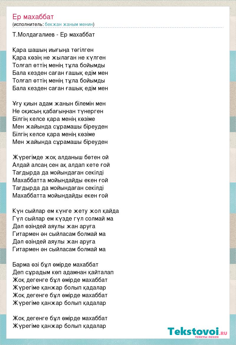 Т.Молдағалиев - Ер махаббат Қара шашың иығыңа төгілген Қара көзің не жылаған не күлген Толғап өттің менің тұла бойымды Бала кезден саған ғашық едім мен Толғап өттің менің тұла бойымды Бала кезден саған ғашық едім мен Ұғу қиын адам жанын білемін мен Не оқисың қабағыңнан түнерген Білгің келсе қара менің көзіме Мен жайында сұрамашы біреуден Білгің келсе қара менің көзіме Мен жайында сұрамашы біреуден Жүрегімде жоқ алданыш бөтен ой Алдай алсаң сен ақ алдап кете ғой Тағдырда да мойындаған секілді Махаббатта мойындайды екен ғой Тағдырда да мойындаған секілді Махаббатта мойындайды екен ғой Күн сыйлар ем күнге жету жол қайда Гүл сыйлар ем күзде гүл солмай ма Дәл өзіндей аяулы жан аруға Гитармен ән сыйласам болмай ма Дәл өзіндей аяулы жан аруға Гитармен ән сыйласам болмай ма Барма өзі бұл өмірде махаббат Деп сұрадым көп адамнан қайталап Жоқ дегенге бұл өмірде махаббат Жүрегіме қанжар болып қадалар Жоқ дегенге бұл өмірде махаббат Жүрегіме қанжар болып қадалар Жоқ дегенге бұл өмірде махаббат Жүрегіме қанжар болып қадалар