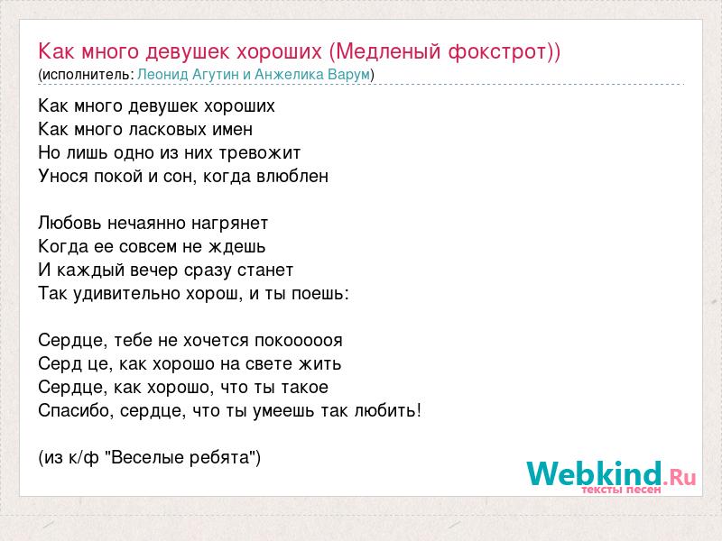 Как много девушек хороших Как много ласковых имен Но лишь одно из них тревожит Унося покой и сон, когда влюблен Любовь нечаянно нагрянет Когда ее совсем не ждешь И каждый вечер сразу станет Так удивительно хорош, и ты поешь: Сердце, тебе не хочется покоооооя Серд це, как хорошо на свете жить Сердце, как хорошо, что ты такое Спасибо, сердце, что ты умеешь так любить! (из к/ф "Веселые ребята")