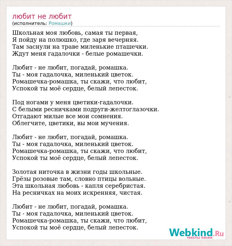 Школьная моя любовь, самая ты первая, Я пойду на полюшко, где заря вечерняя. Там заснули на траве миленькие пташечки. Ждут меня гадалочки - белые ромашечки. Любит - не любит, погадай, ромашка. Ты - моя гадалочка, миленький цветок. Ромашечка-ромашка, ты скажи, что любит, Успокой ты моё сердце, белый лепесток. Под ногами у меня цветики-гадалочки. С белыми ресничками подруги-желтоглазочки. Отгадают милые все мои сомнения. Облегчите, цветики, вы мои мучения. Любит - не любит, погадай, ромашка. Ты - моя гадалочка, миленький цветок. Ромашечка-ромашка, ты скажи, что любит, Успокой ты моё сердце, белый лепесток. Золотая ниточка в жизни годы школьные. Грёзы розовые там, словно птицы вольные. Эта школьная любовь - капля серебристая. На ресничках на моих искренняя, чистая. Любит - не любит, погадай, ромашка. Ты - моя гадалочка, миленький цветок. Ромашечка-ромашка, ты скажи, что любит, Успокой ты моё сердце, белый лепесток.