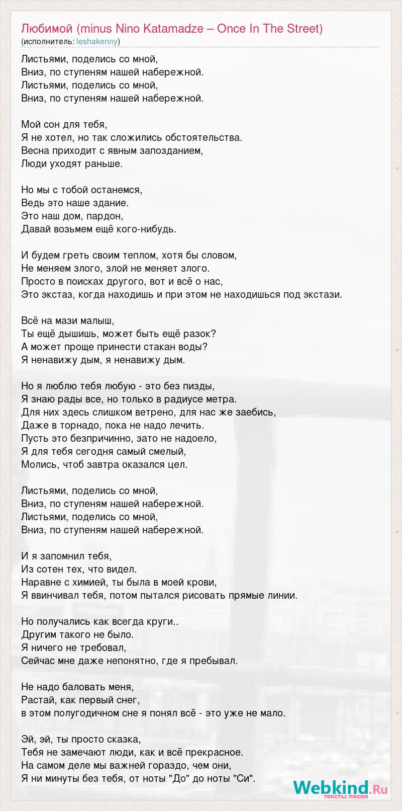 Листьями, поделись со мной, Вниз, по ступеням нашей набережной. Листьями, поделись со мной, Вниз, по ступеням нашей набережной. Мой сон для тебя, Я не хотел, но так сложились обстоятельства. Весна приходит с явным запозданием, Люди уходят раньше. Но мы с тобой останемся, Ведь это наше здание. Это наш дом, пардон, Давай возьмем ещё кого-нибудь. И будем греть своим теплом, хотя бы словом, Не меняем злого, злой не меняет злого. Просто в поисках другого, вот и всё о нас, Это экстаз, когда находишь и при этом не находишься под экстази. Всё на мази малыш, Ты ещё дышишь, может быть ещё разок? А может проще принести стакан воды? Я ненавижу дым, я ненавижу дым. Но я люблю тебя любую - это без пизды, Я знаю рады все, но только в радиусе метра. Для них здесь слишком ветрено, для нас же заебись, Даже в торнадо, пока не надо лечить. Пусть это безпричинно, зато не надоело, Я для тебя сегодня самый смелый, Молись, чтоб завтра оказался цел. Листьями, поделись со мной, Вниз, по ступеням нашей набережной. Листьями, поделись со мной, Вниз, по ступеням нашей набережной. И я запомнил тебя, Из сотен тех, что видел. Наравне с химией, ты была в моей крови, Я ввинчивал тебя, потом пытался рисовать прямые линии. Но получались как всегда круги.. Другим такого не было. Я ничего не требовал, Сейчас мне даже непонятно, где я пребывал. Не надо баловать меня, Растай, как первый снег, в этом полугодичном сне я понял всё - это уже не мало. Эй, эй, ты просто сказка, Тебя не замечают люди, как и всё прекрасное. На самом деле мы важней гораздо, чем они, Я ни минуты без тебя, от ноты "До" до ноты "Си".