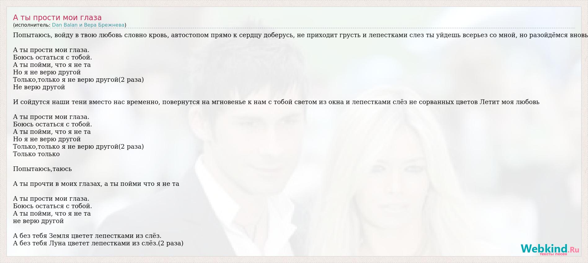Попытаюсь, войду в твою любовь словно кровь, автостопом прямо к сердцу доберусь, не приходит грусть и лепестками слез ты уйдешь всерьез со мной, но разойдёмся вновь А ты прости мои глаза. Боюсь остаться с тобой. А ты пойми, что я не та Но я не верю другой Только,только я не верю другой(2 раза) Не верю другой И сойдутся наши тени вместо нас временно, повернутся на мгновенье к нам с тобой светом из окна и лепестками слёз не сорванных цветов Летит моя любовь А ты прости мои глаза. Боюсь остаться с тобой. А ты пойми, что я не та Но я не верю другой Только,только я не верю другой(2 раза) Только только Попытаюсь,таюсь А ты прочти в моих глазах, а ты пойми что я не та А ты прости мои глаза. Боюсь остаться с тобой. А ты пойми, что я не та не верю другой А без тебя Земля цветет лепестками из слёз. А без тебя Луна цветет лепестками из слёз.(2 раза)