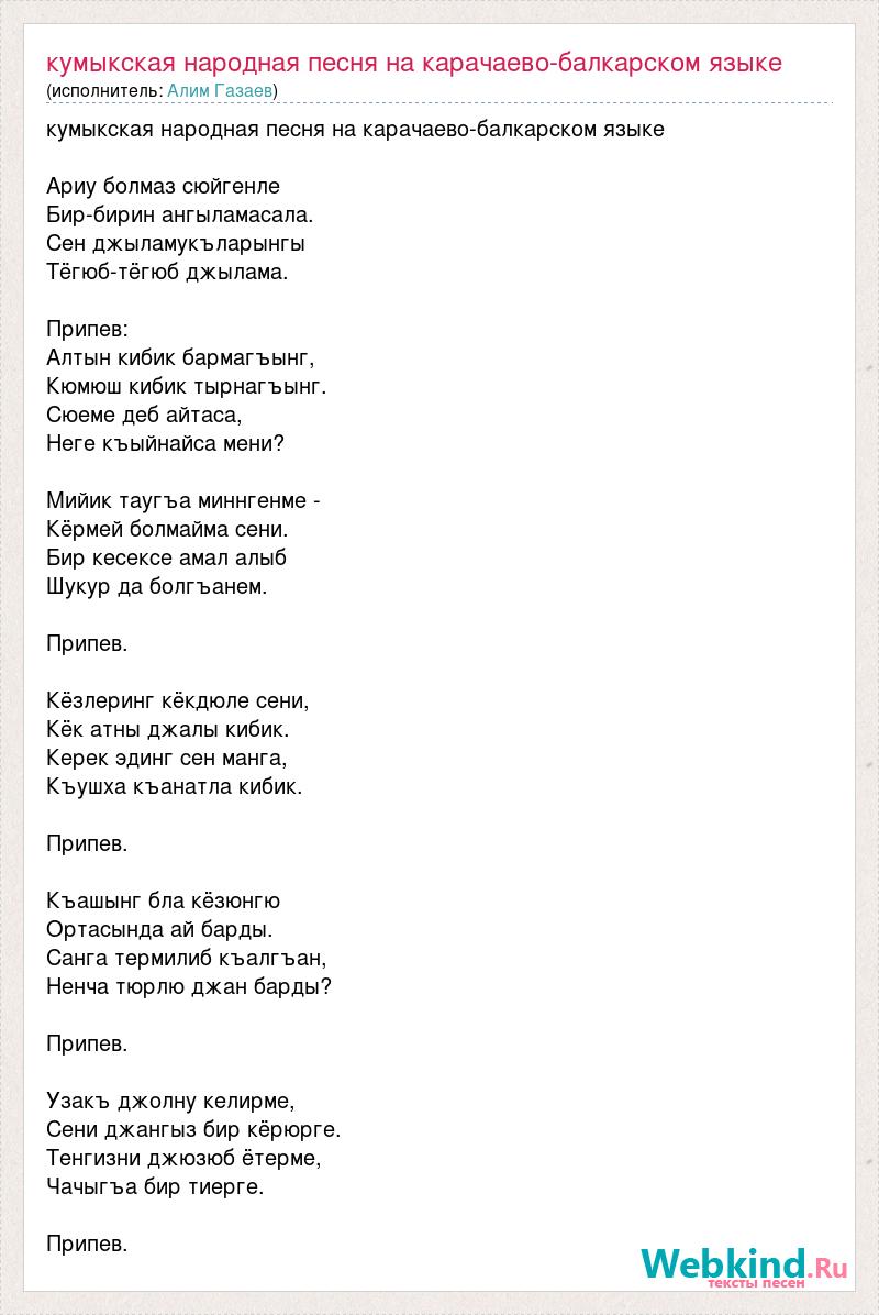 кумыкская народная песня на карачаево-балкарском языке Ариу болмаз сюйгенле Бир-бирин ангыламасала. Сен джыламукъларынгы Тёгюб-тёгюб джылама. Припев: Алтын кибик бармагъынг, Кюмюш кибик тырнагъынг. Сюеме деб айтаса, Неге къыйнайса мени? Мийик таугъа миннгенме - Кёрмей болмайма сени. Бир кесексе амал алыб Шукур да болгъанем. Припев. Кёзлеринг кёкдюле сени, Кёк атны джалы кибик. Керек эдинг сен манга, Къушха къанатла кибик. Припев. Къашынг бла кёзюнгю Ортасында ай барды. Санга термилиб къалгъан, Ненча тюрлю джан барды? Припев. Узакъ джолну келирме, Сени джангыз бир кёрюрге. Тенгизни джюзюб ётерме, Чачыгъа бир тиерге. Припев.
