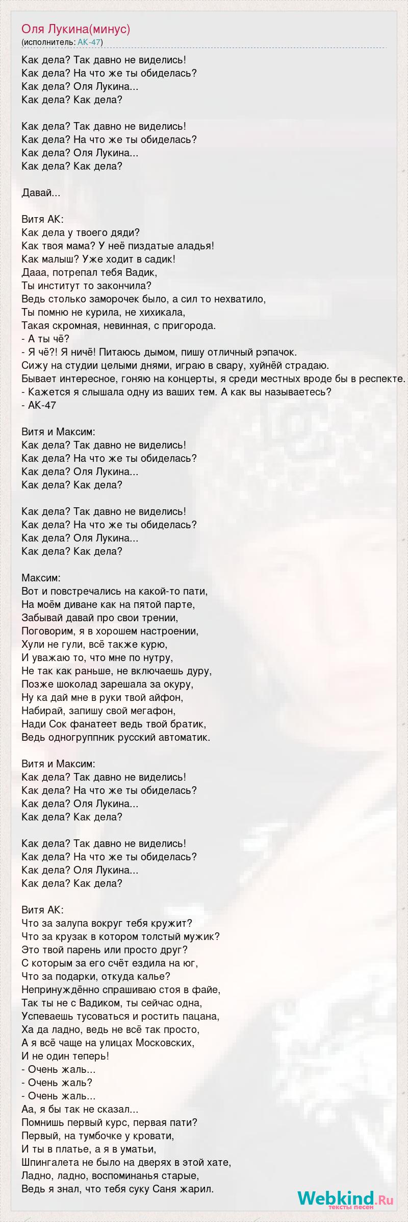 Как дела? Так давно не виделись! Как дела? На что же ты обиделась? Как дела? Оля Лукина... Как дела? Как дела? Как дела? Так давно не виделись! Как дела? На что же ты обиделась? Как дела? Оля Лукина... Как дела? Как дела? Давай... Витя АК: Как дела у твоего дяди? Как твоя мама? У неё пиздатые аладья! Как малыш? Уже ходит в садик! Дааа, потрепал тебя Вадик, Ты институт то закончила? Ведь столько заморочек было, а сил то нехватило, Ты помню не курила, не хихикала, Такая скромная, невинная, с пригорода. - А ты чё? - Я чё?! Я ничё! Питаюсь дымом, пишу отличный рэпачок. Сижу на студии целыми днями, играю в свару, хуйнёй страдаю. Бывает интересное, гоняю на концерты, я среди местных вроде бы в респекте. - Кажется я слышала одну из ваших тем. А как вы называетесь? - АК-47 Витя и Максим: Как дела? Так давно не виделись! Как дела? На что же ты обиделась? Как дела? Оля Лукина... Как дела? Как дела? Как дела? Так давно не виделись! Как дела? На что же ты обиделась? Как дела? Оля Лукина... Как дела? Как дела? Максим: Вот и повстречались на какой-то пати, На моём диване как на пятой парте, Забывай давай про свои трении, Поговорим, я в хорошем настроении, Хули не гули, всё также курю, И уважаю то, что мне по нутру, Не так как раньше, не включаешь дуру, Позже шоколад зарешала за окуру, Ну ка дай мне в руки твой айфон, Набирай, запишу свой мегафон, Нади Сок фанатеет ведь твой братик, Ведь одногруппник русский автоматик. Витя и Максим: Как дела? Так давно не виделись! Как дела? На что же ты обиделась? Как дела? Оля Лукина... Как дела? Как дела? Как дела? Так давно не виделись! Как дела? На что же ты обиделась? Как дела? Оля Лукина... Как дела? Как дела? Витя АК: Что за залупа вокруг тебя кружит? Что за крузак в котором толстый мужик? Это твой парень или просто друг? С которым за его счёт ездила на юг, Что за подарки, откуда калье? Непринуждённо спрашиваю стоя в файе, Так ты не с Вадиком, ты сейчас одна, Успеваешь тусоваться и ростить пацана, Ха да ладно, ведь не всё так просто, А я всё чаще на улицах Московских, И не один теперь! - Очень жаль... - Очень жаль? - Очень жаль... Аа, я бы так не сказал... Помнишь первый курс, первая пати? Первый, на тумбочке у кровати, И ты в платье, а я в уматьи, Шпингалета не было на дверях в этой хате, Ладно, ладно, воспоминанья старые, Ведь я знал, что тебя суку Саня жарил.