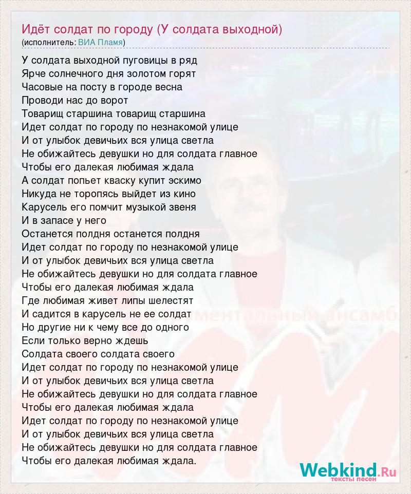 У солдата выходной пуговицы в ряд Ярче солнечного дня золотом горят Часовые на посту в городе весна Проводи нас до ворот Товарищ старшина товарищ старшина Идет солдат по городу по незнакомой улице И от улыбок девичьих вся улица светла Не обижайтесь девушки но для солдата главное Чтобы его далекая любимая ждала А солдат попьет кваску купит эскимо Никуда не торопясь выйдет из кино Карусель его помчит музыкой звеня И в запасе у него Останется полдня останется полдня Идет солдат по городу по незнакомой улице И от улыбок девичьих вся улица светла Не обижайтесь девушки но для солдата главное Чтобы его далекая любимая ждала Где любимая живет липы шелестят И садится в карусель не ее солдат Но другие ни к чему все до одного Если только верно ждешь Солдата своего солдата своего Идет солдат по городу по незнакомой улице И от улыбок девичьих вся улица светла Не обижайтесь девушки но для солдата главное Чтобы его далекая любимая ждала Идет солдат по городу по незнакомой улице И от улыбок девичьих вся улица светла Не обижайтесь девушки но для солдата главное Чтобы его далекая любимая ждала.
